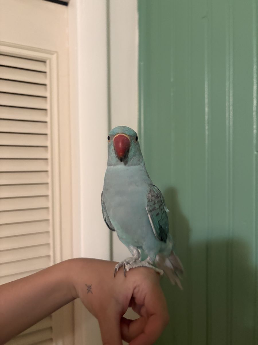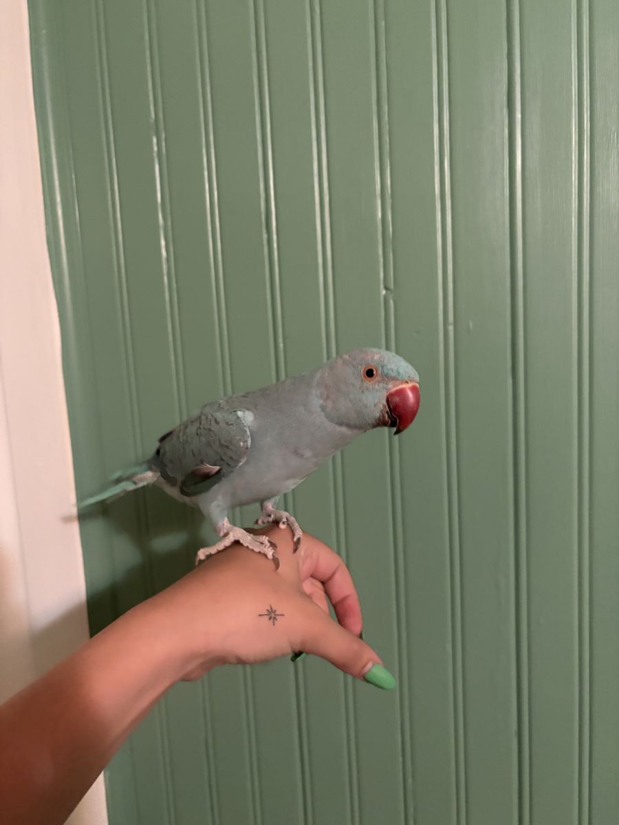 ApplePay10 month old Indian ringneck unsure of gender knows how to step up and is starting to mimic it us a little jumpy around cage but once away from cage it’s a good bird
