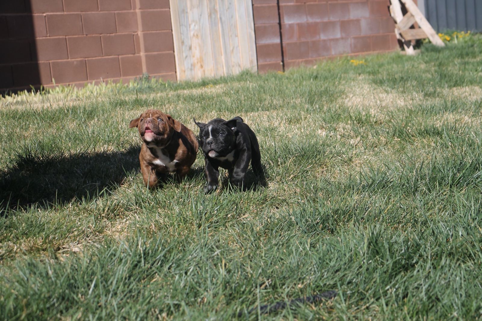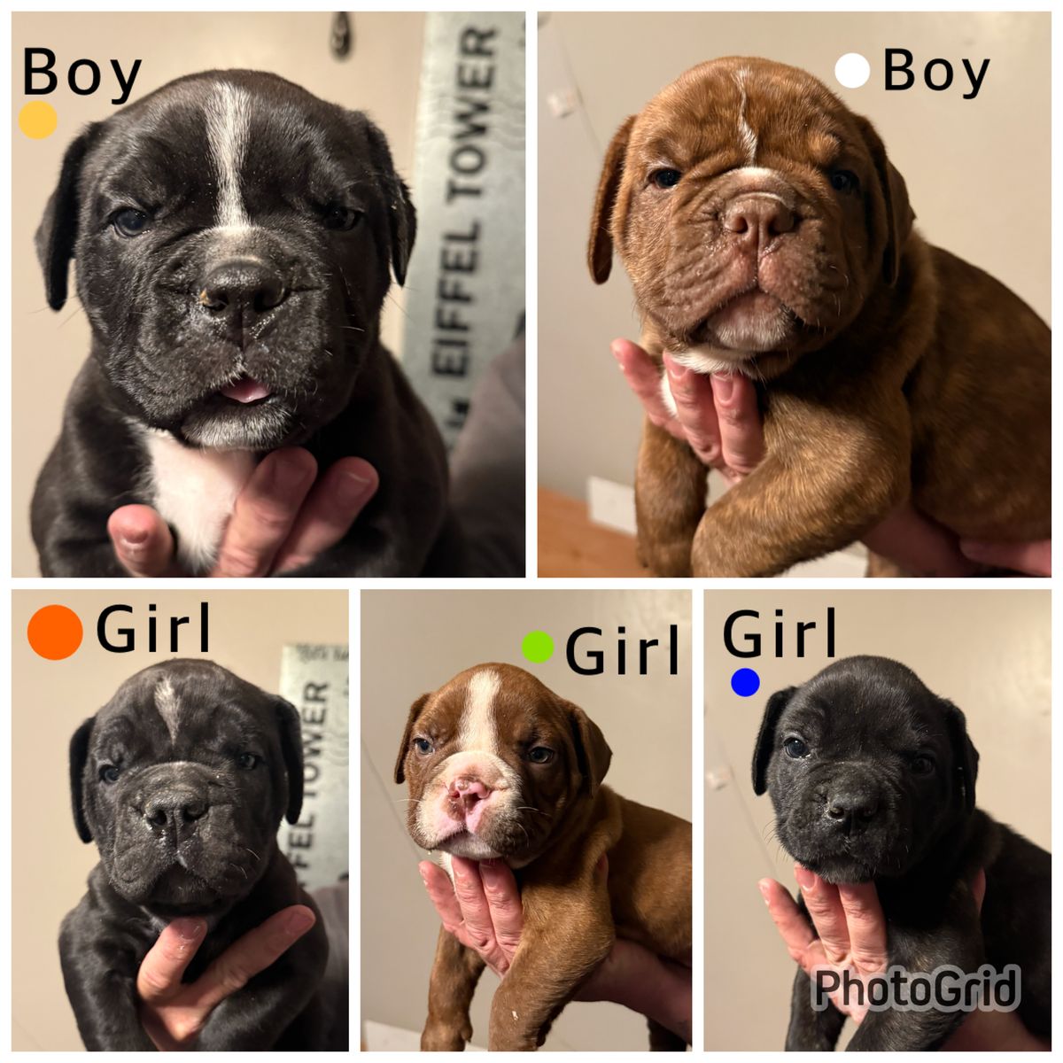 ApplePayThey are currently 7 weeks old tomorrow we haves 3 girls and 2 boys ready for their forever homes. Both mom and dad are purebred and papered. They are not the small English bully's. They are the big guys. Can send more pictures and proof of their blood lines. Pricing starts at $2500. They are all different prices.