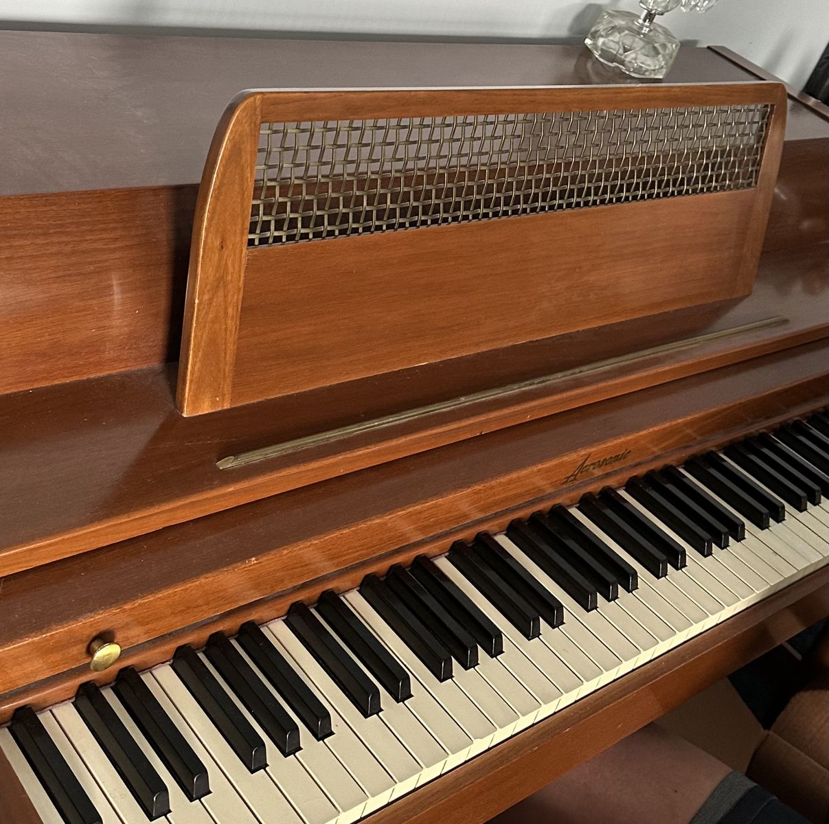 Description: Beautiful Baldwin Acrosonic upright piano in a warm mid-century wood finish. Acrosonic pianos are known for their quality craftsmanship and rich tone—made by Baldwin, one of the most respected piano manufacturers.