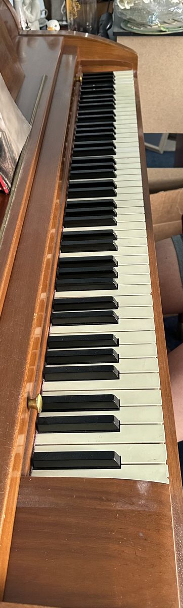 Details: • Full keyboard – all keys present and playable • Sounds great (see video) • Solid wood cabinet with mid-century design • Acrosonic by Baldwin (highly regarded console piano)