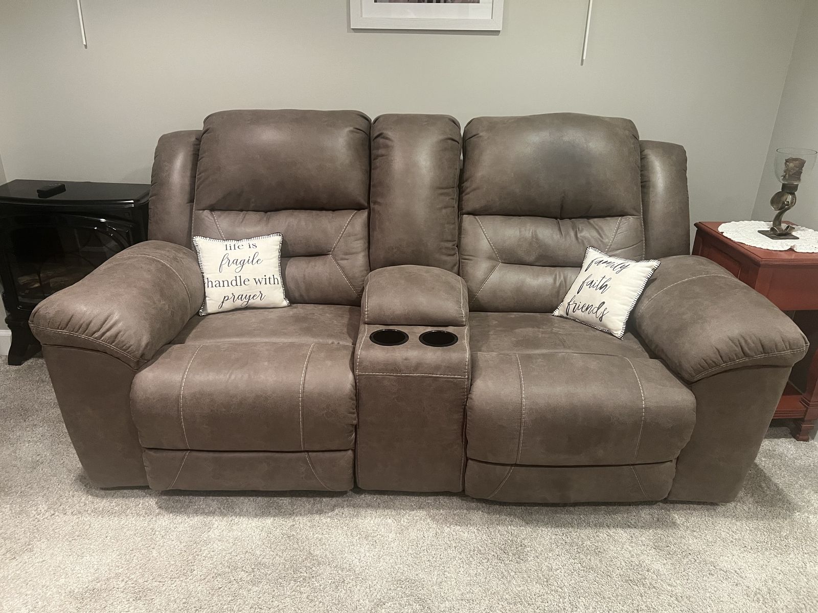 Less than a year old. Moving and must sell. Sofa and Love Seat recliners. Not sure what they are made of. Look like leather.