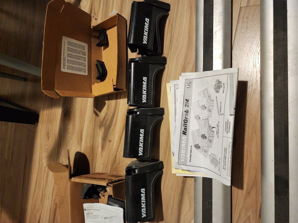ZelleYakima roof rack with RailGrab towers and a fork-mount bike carrier. Includes crossbars, hardware, and manuals. Fits vehicles with raised side rails. Good used condition. $100 OBO.