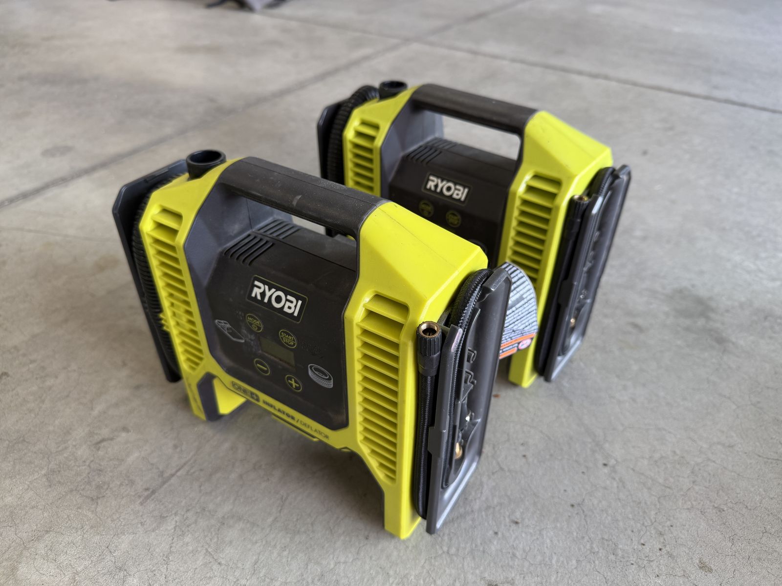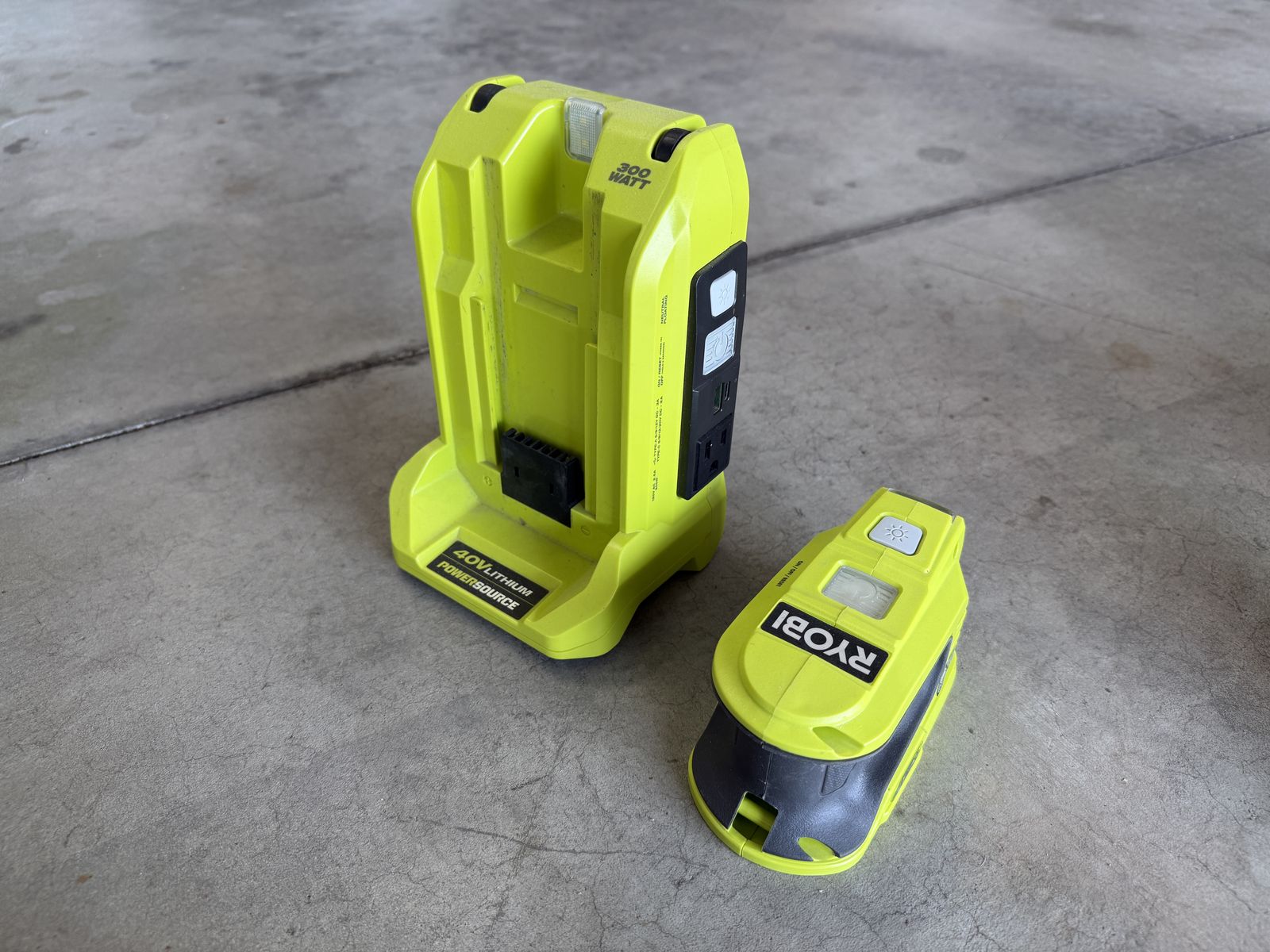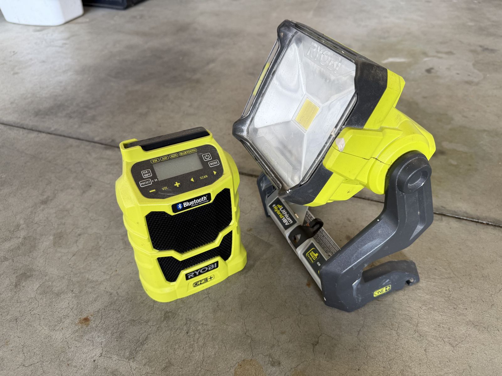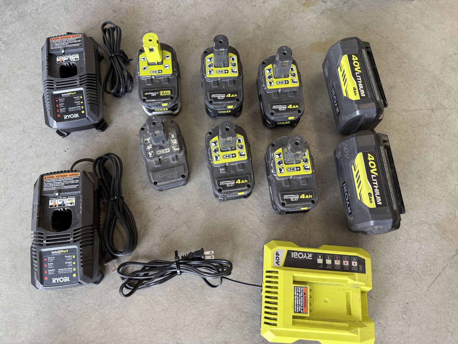 5 4ah 18v batteries, 2 40v batteries 6 ah & 4 ah, 3 chargers, 2 inflators, 1 40v chainsaw, 1 shop light, 1 radio/speaker, and 2 inverters: a18v and a 40v.