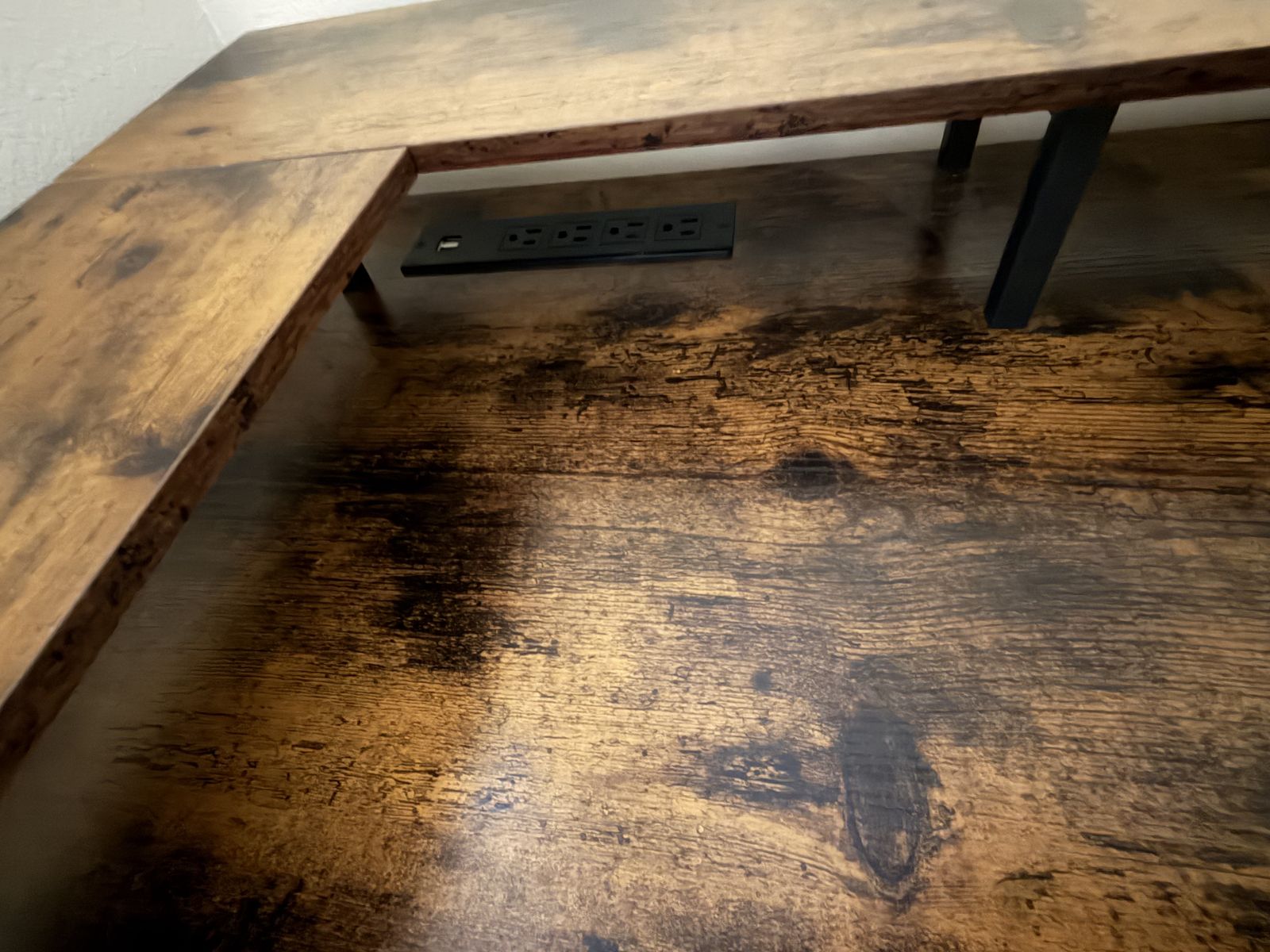 One nightstands fabric is a little ripped but still opens and closes and works. Desk is in perfect shape and has outlets on the desk. Great office desk.