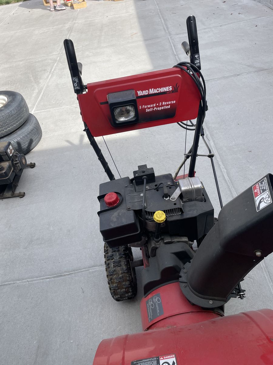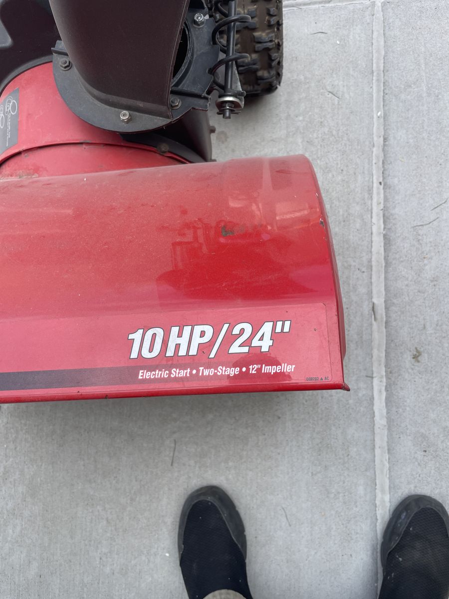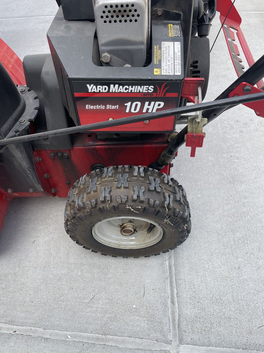Large snow blower with the larger 10 horsepower engine and electric plugin start so no messing around with a battery this machine has such little use on it that the tires still have some of the little nubs on them this was my stepfathers and he just didn’t use it much because it was a little heavy for him to handle