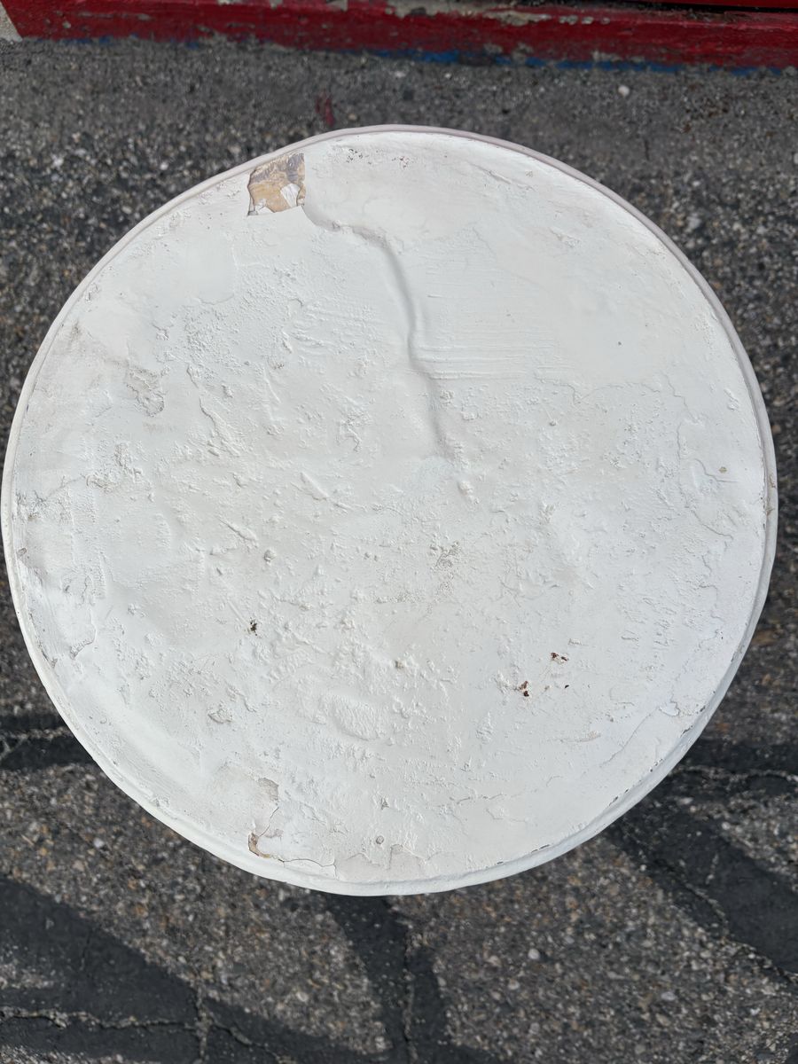 • Heavy metal base • Distressed white round top • Ornate vintage detailing • Compact and versatile