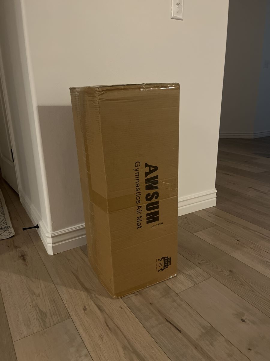 It is an “awsum gymnastics air mat” on Amazon. I bought it and forgot about it and just found it when we were cleaning out storage. The box has not been opened.