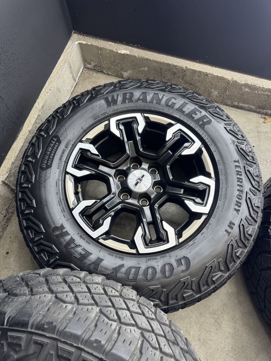 18” OEM Chevy ZR2 wheels and tires of a ZR2 Silverado 1500, All center caps are included. No Curb Rash or Major Damage. Wheels are hard to come by as they only come on the ZR2 Edition Silverados. Tires are 275/70r18 GOODYEAR WRANGLER A/T top of the line tires.
