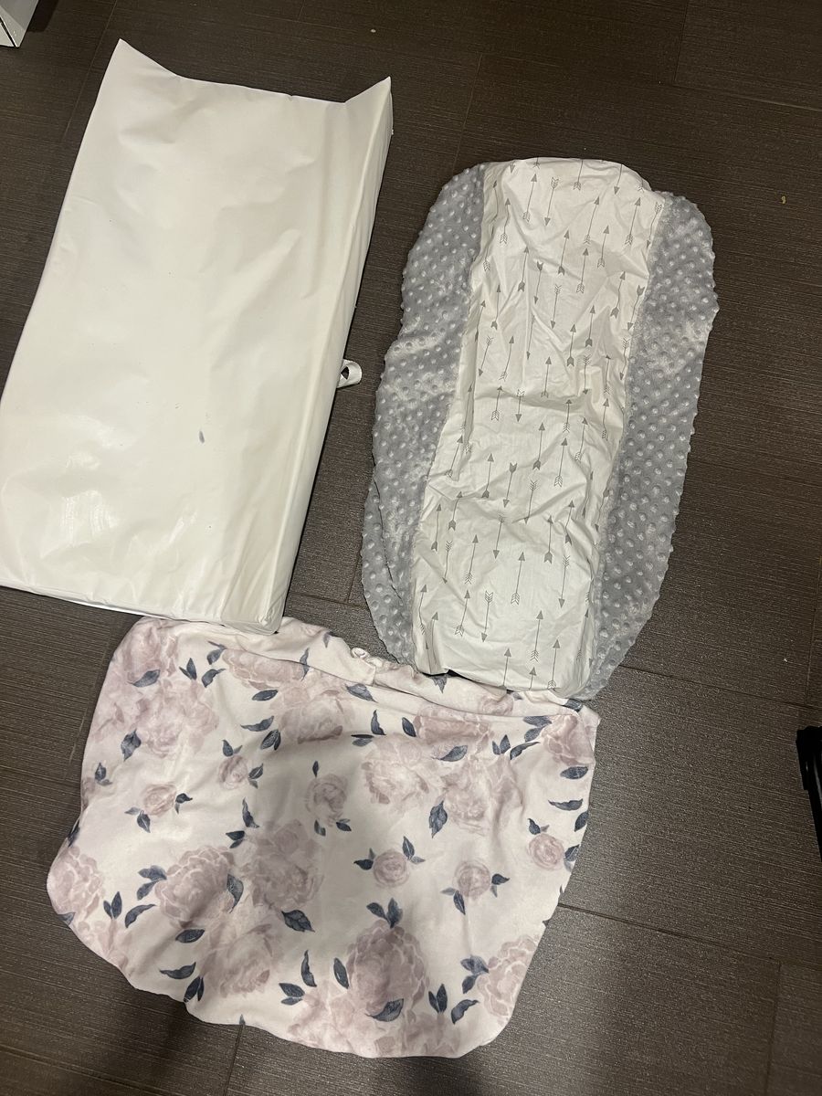 VenmoMunchkin brand foam changing pad with Minky couture floral cover and Cloud Island arrow cover.