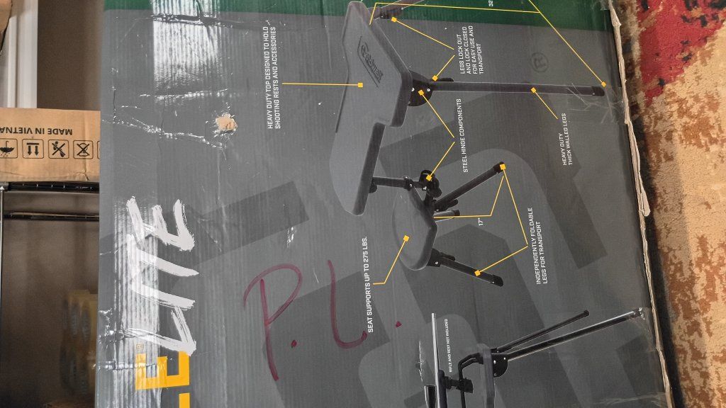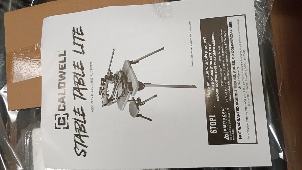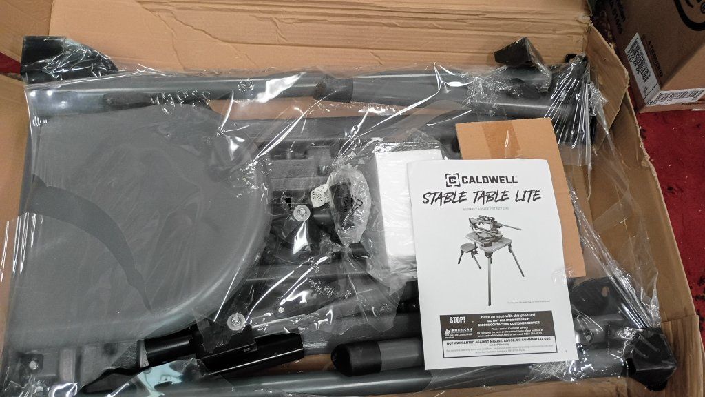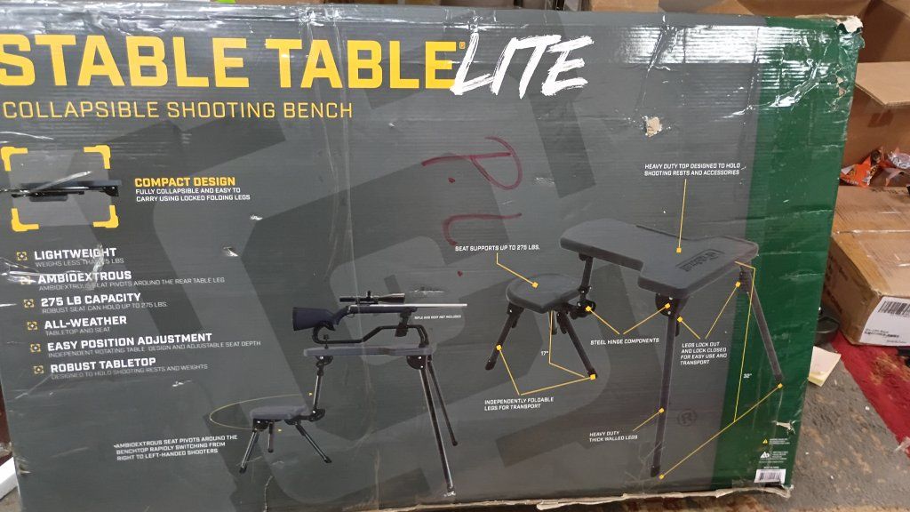 New in box Caldwell Stable Table Lite Portable Bench Table is 23″ wide and 34″ long with a leg height of 32″ and a seat height of 17″