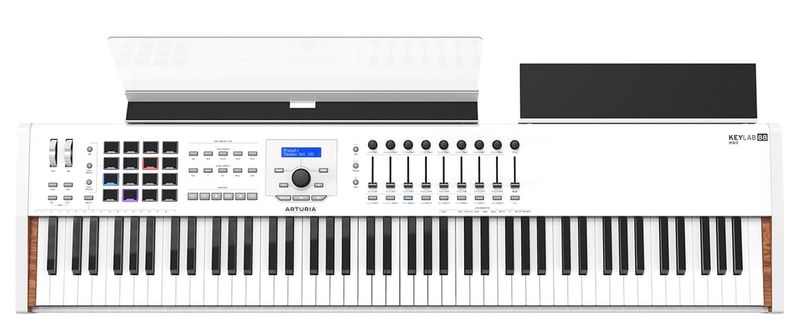Highlights • 88-key Fatar hammer-action keybed with aftertouch (real piano feel) • 3.5” color display for easy navigation • 16 RGB performance pads (large & super responsive) • 9 faders + 9 rotary encoders for hands-on mixing/control • Built-in arpeggiator, chord & scale modes • USB-C + MIDI In/Out + pedal inputs • Solid metal chassis with pro build quality