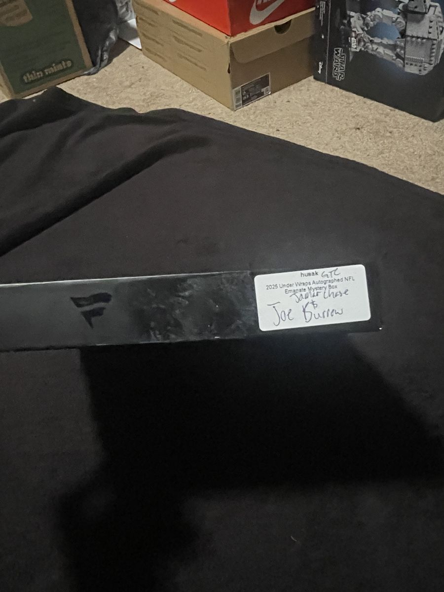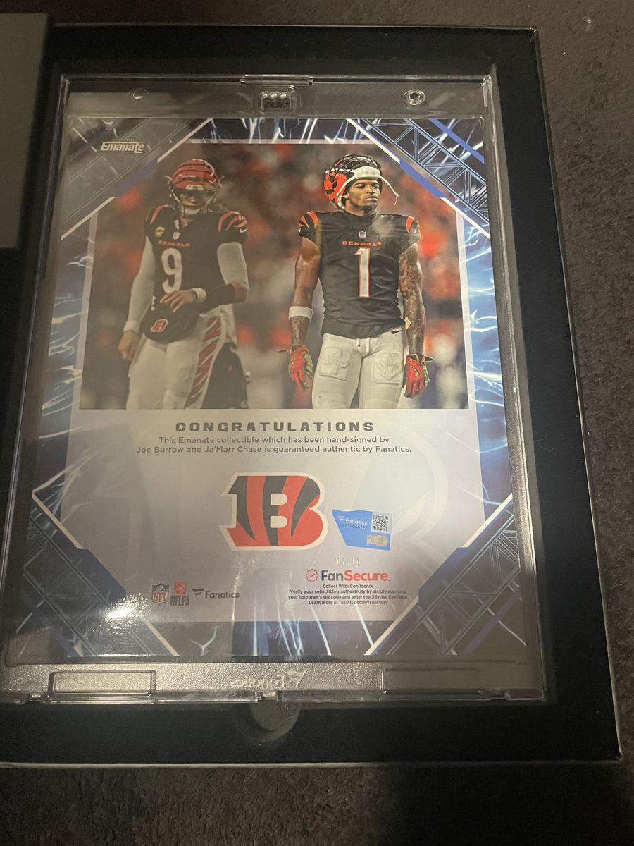 Ultra-rare Fanatics Emanate piece featuring Joe Burrow and Ja'Marr Chase — hand signed by both. Numbered 7 out of 10. The shell it came in has hand and finger prints on it as it was opened in a stream, box also has a label and another label was removed but sticky residue is left over. The shell just protects the emanate, this would be prefect for a Bengals fans to add to their collection.