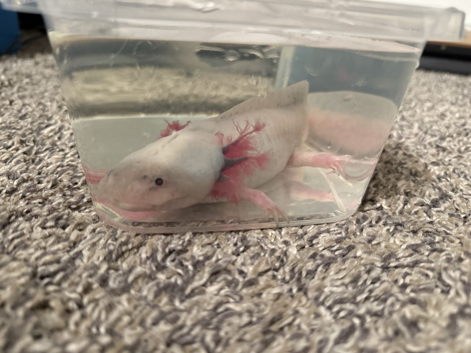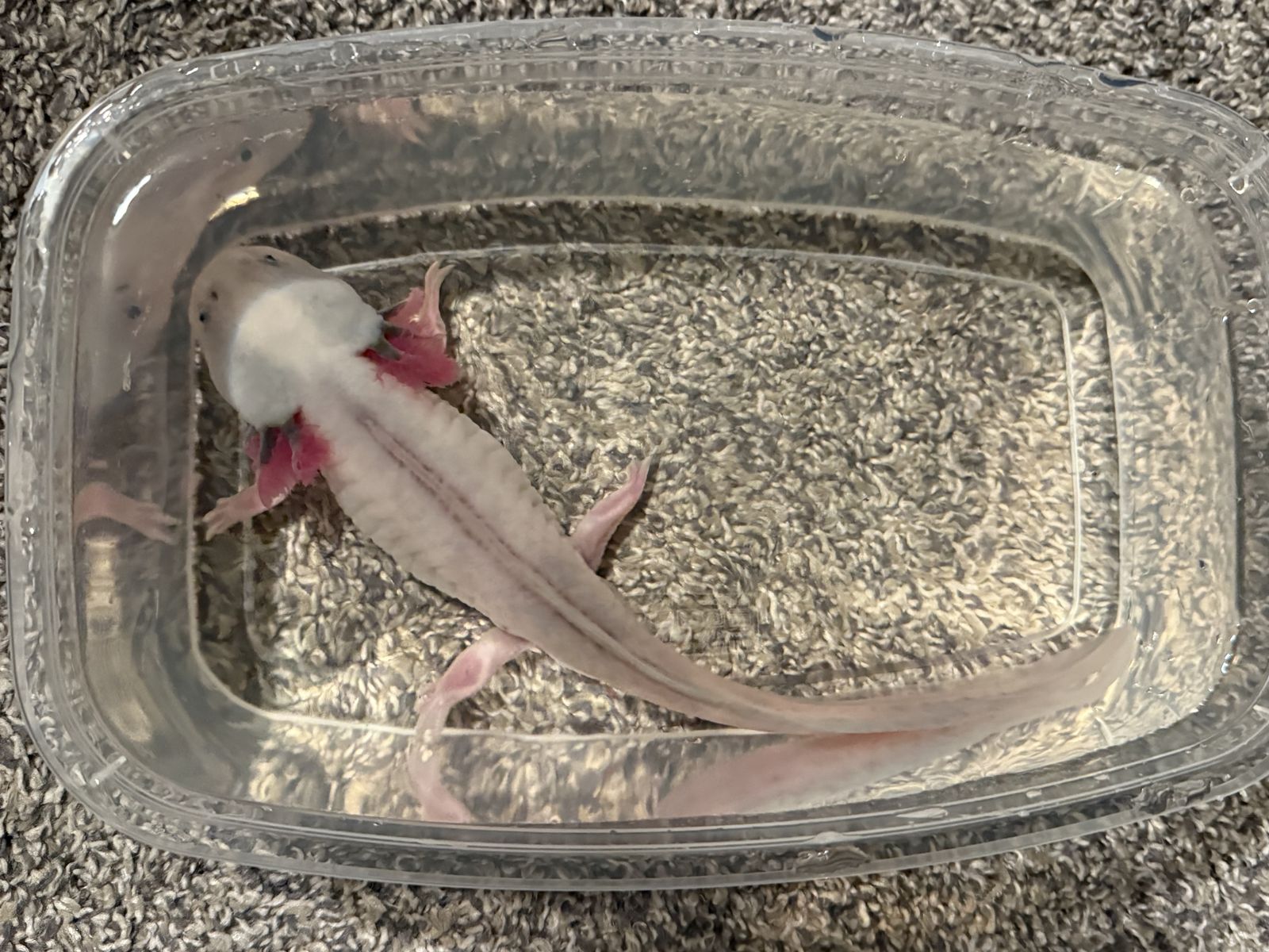ApplePay2 year old male dirty leucistic axolotl for rehoming. He’s currently on a diet of pellets and occasionally live red worms. He will take them from tongs and is generally pretty friendly.