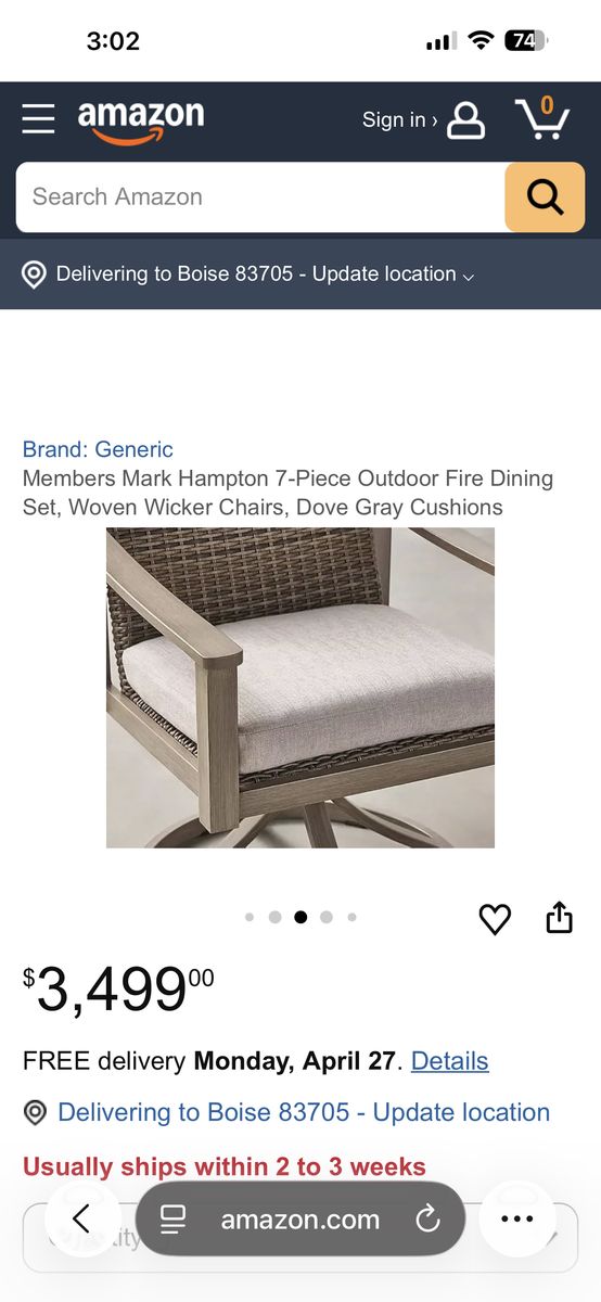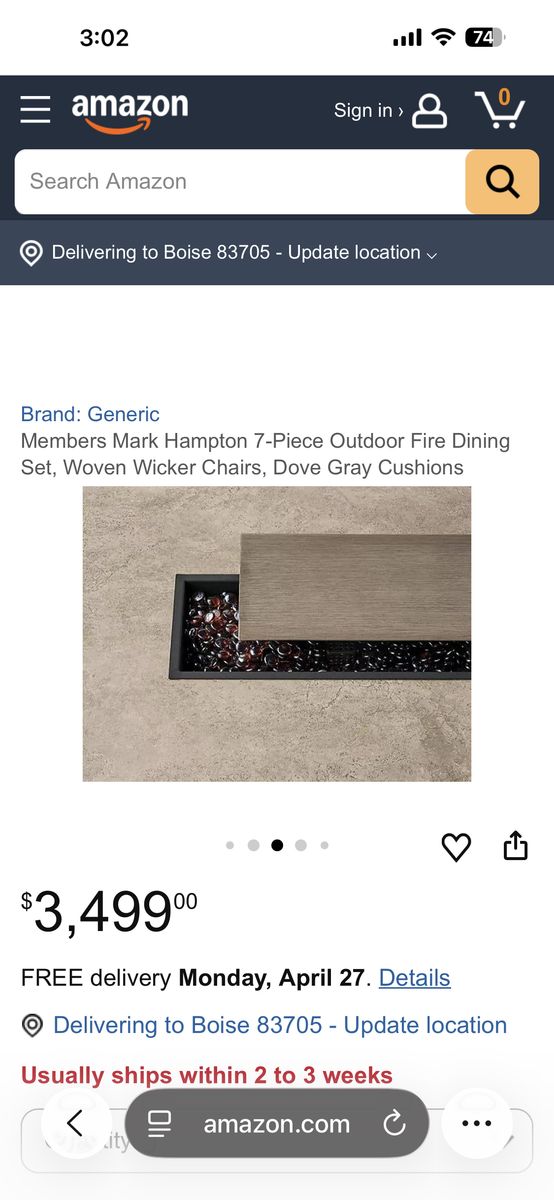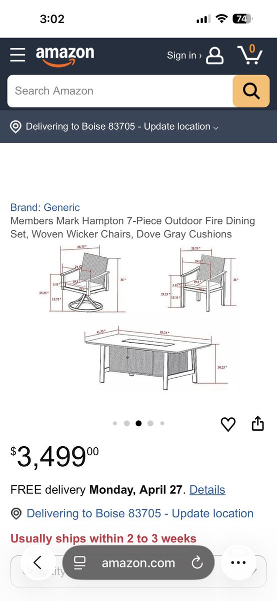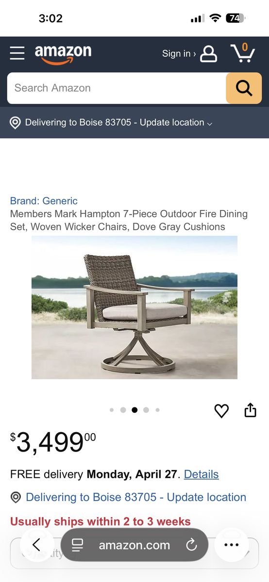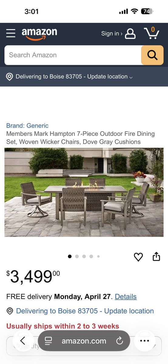 VenmoStylish Members Mark Hampton 7-piece outdoor dining set. Has a fire dining table, 4 standard woven wicker chairs, 2 swivel woven wicker chairs. Comes with dove gray cushions made with Sunbrella fabric. There is a crack in the table top. Perfect for patio or outdoor dining or entertainment. Will deliver for an additional fee.