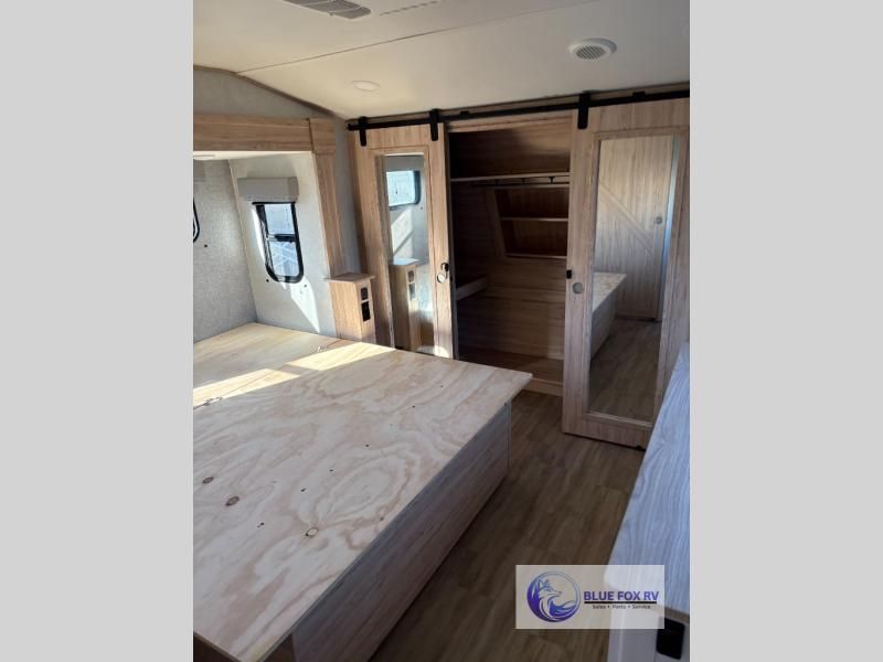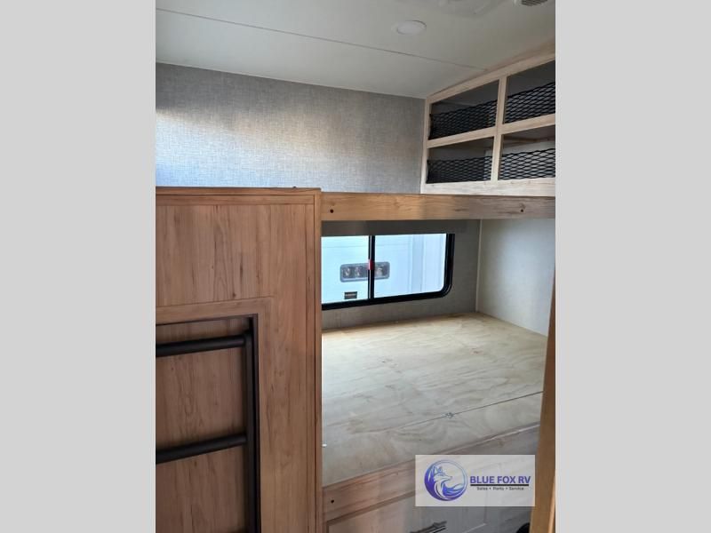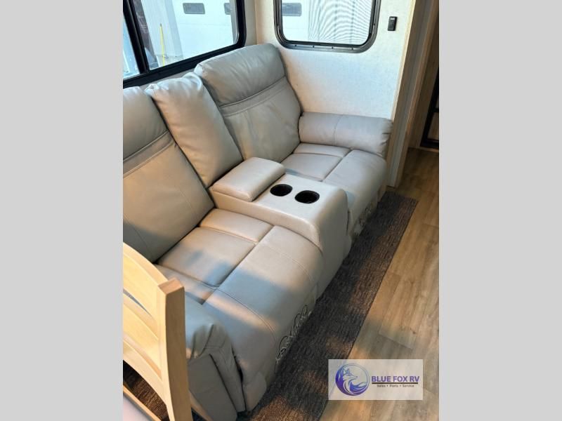 The whole gang can join in on the fun in this fifth wheel! The rear private bunkhouse has a 56" x 74" upper bunk with storage, a 56" x 74" lower bunk, a lower bunk wardrobe, and its very own half bathroom. The living area comes with dual recliner seating, a swing out 50" class HDTV, and a floating dinette table with two chairs on one side and a movable ottoman with flip up storage on the other side. You can easily prepare your best home cooked meals with the kitchen island and three burner cooktop, as well as store everyone's favorite snacks inside the hutch/pantry and the second pantry. When you're ready to wind down your night, head to the front private bedroom and relax on the queen bed slide which could be switched out for the optional king bed if you chose!