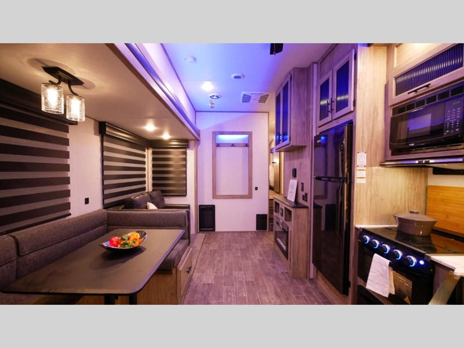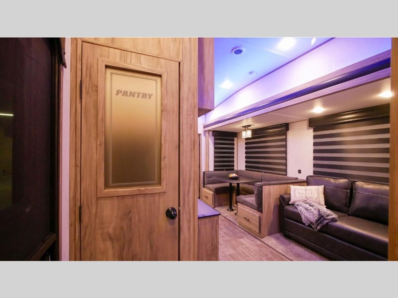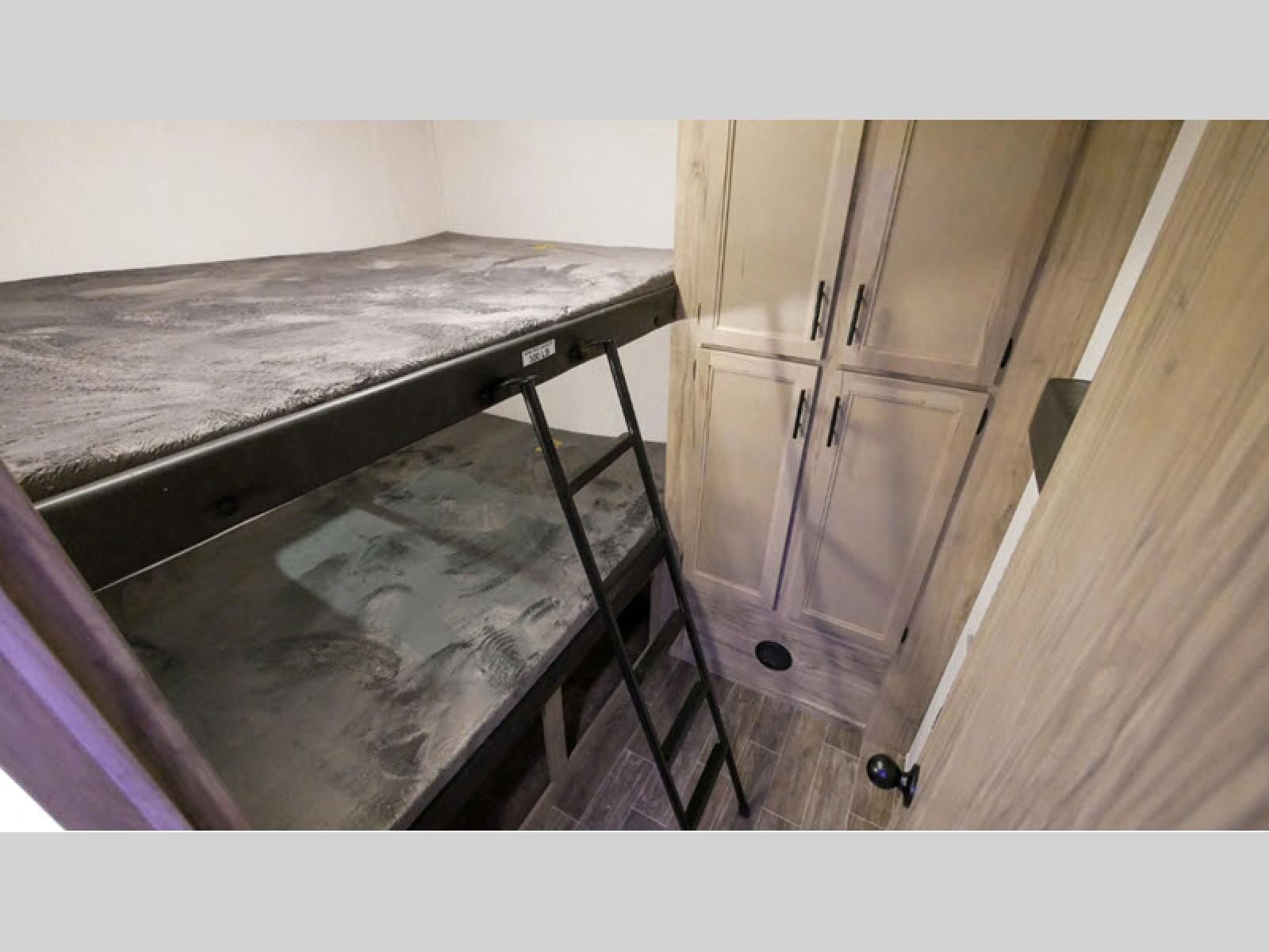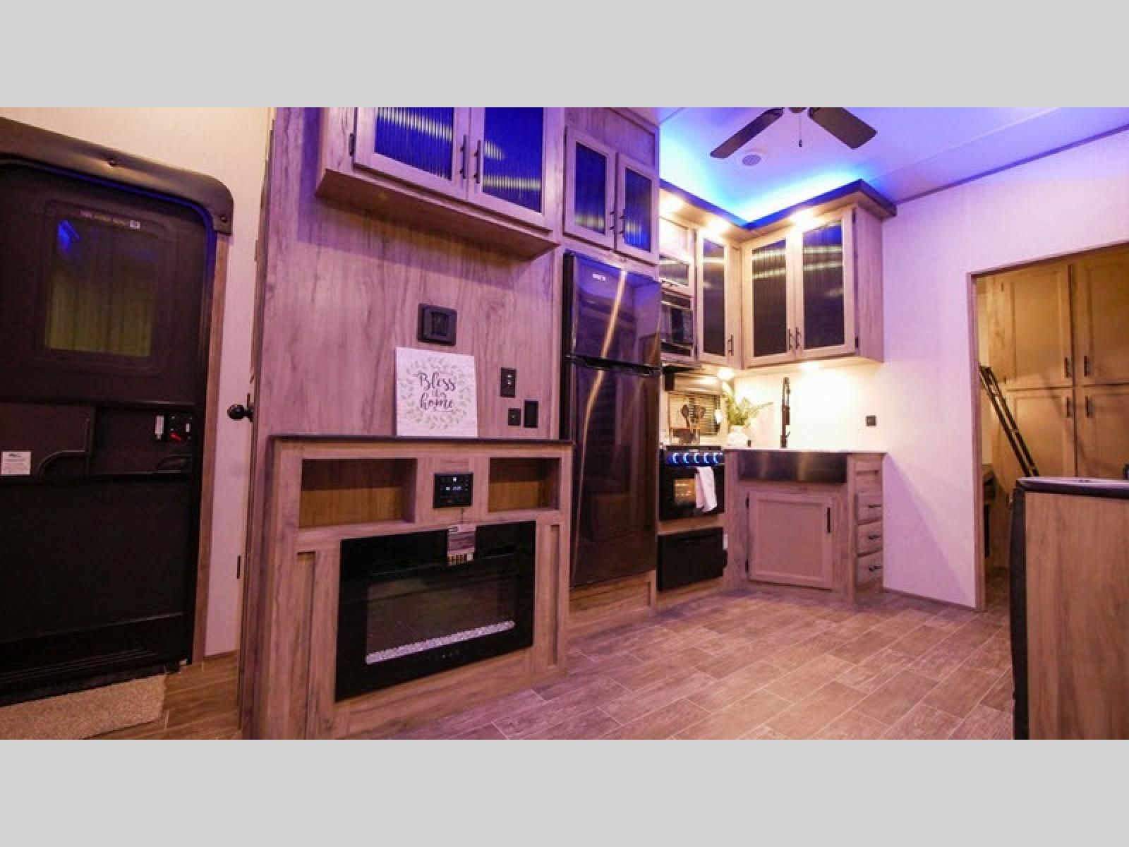 Let the fun times begin with the purchase of this Cherokee Arctic Wolf fifth wheel! You'll have loads of sleeping space for ten tired travelers with the front private bedroom, rear private bunkhouse, U-shaped dinette, and tri-fold sofa. You'll also have excellent storage space with the storage below the lower bunk in the bunkhouse, the large walk-in pantry next to the entry door, the 11-cubic foot residential refrigerator in the kitchen for your perishables, the under-bed storage and large wardrobe in the bedroom, and the exterior open pass-through storage. You'll also have a large slide in the main living area for more living space, and the ceiling fan will cool you down as you are relaxing. Or, if you need to heat things up a bit, you can just switch on the fireplace.