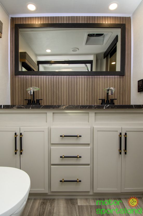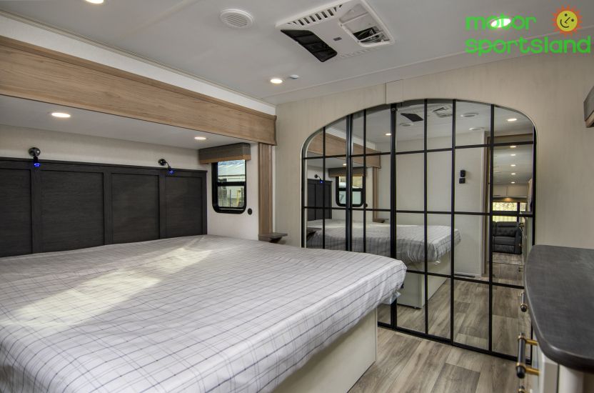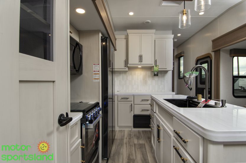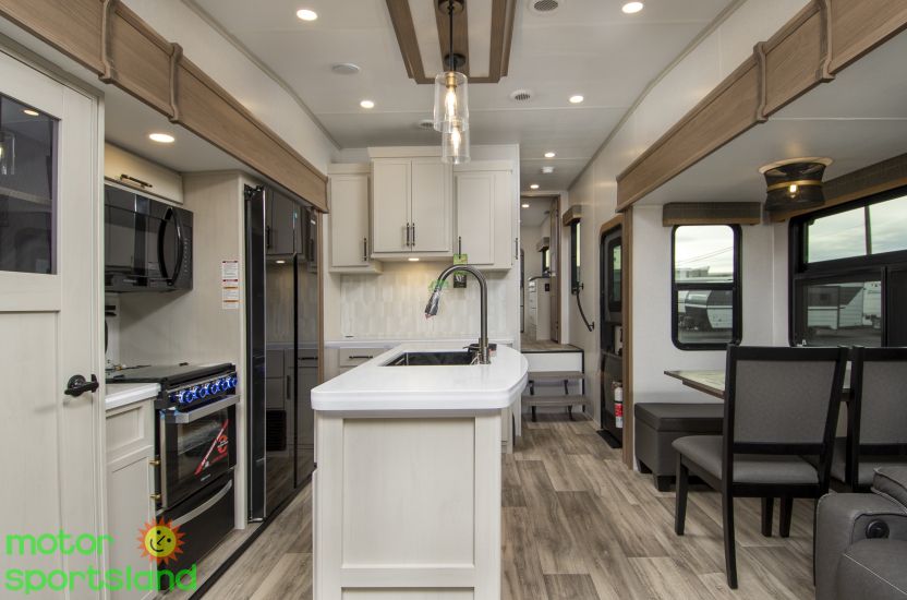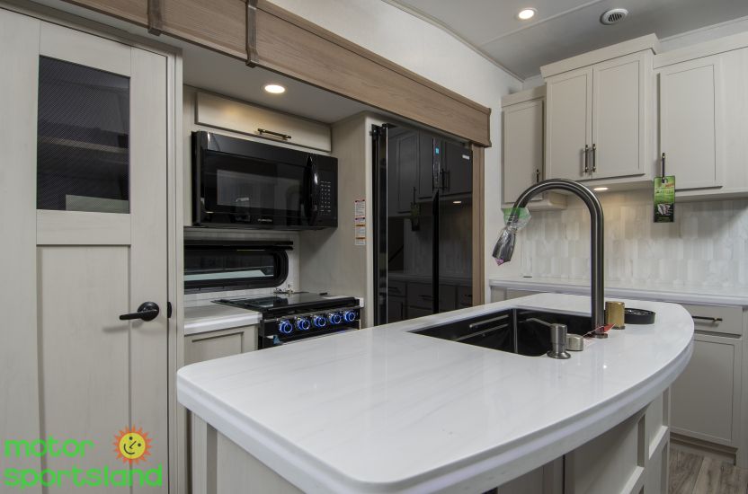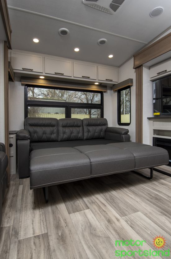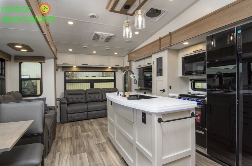 Spacious Layout: The rear living design offers ample space for family bonding, with cozy seating and panoramic windows for breathtaking views. Luxurious Interiors: Premium furnishings, modern appliances, and high-end finishes create a sophisticated, home-like atmosphere. Family-Friendly Features: Multiple sleeping areas, including a private master suite, ensure everyone has their own space to relax after a day of exploration. Top-Notch Comfort: Enjoy climate control, plush bedding, and a fully equipped kitchen for effortless meal prep on the go. Outdoor Ready: An exterior entertainment setup and storage galore make this Fifth Wheel ideal for tailgating or camping in style.