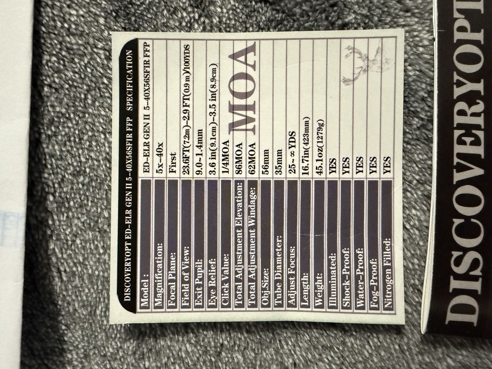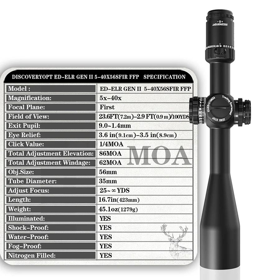 VenmoFor sale is a brand new, in-box DiscoveryOpt ED-ELR GENII 5-40X56SFIR FFP(35mm) MOA scope.