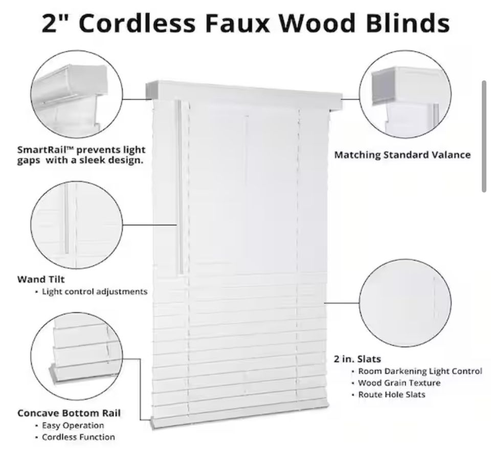 Design meets functionality with the White Cordless Room Darkening 2 in. Faux Wood Blind by Home Decorators Collection. The cordless design has a "no cords" feature. Offering a clean look by eliminating dangling lift cords. Our 2 in. Cordless Faux Wood Blinds come with a matching 2.5 in. standard valance and features a unique embossed wood grain texture that gives the appearance of real wood. These blinds offer a classic look that will complement any decor. The room darkening faux wood slats are made from heat and moisture resistant material, making the blinds ideal window treatments for bathrooms, kitchens and garages. The additional insulation to your windows can add energy saving value to your home. For maximum light and privacy control, rotate the slats downward to ensure proper closure.