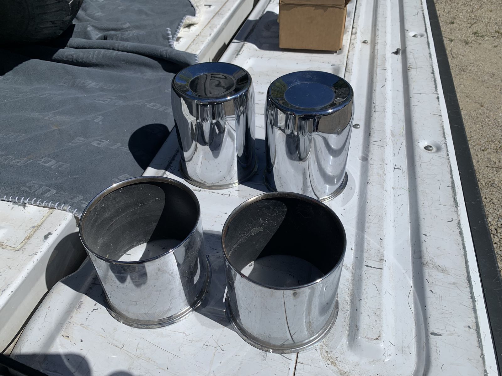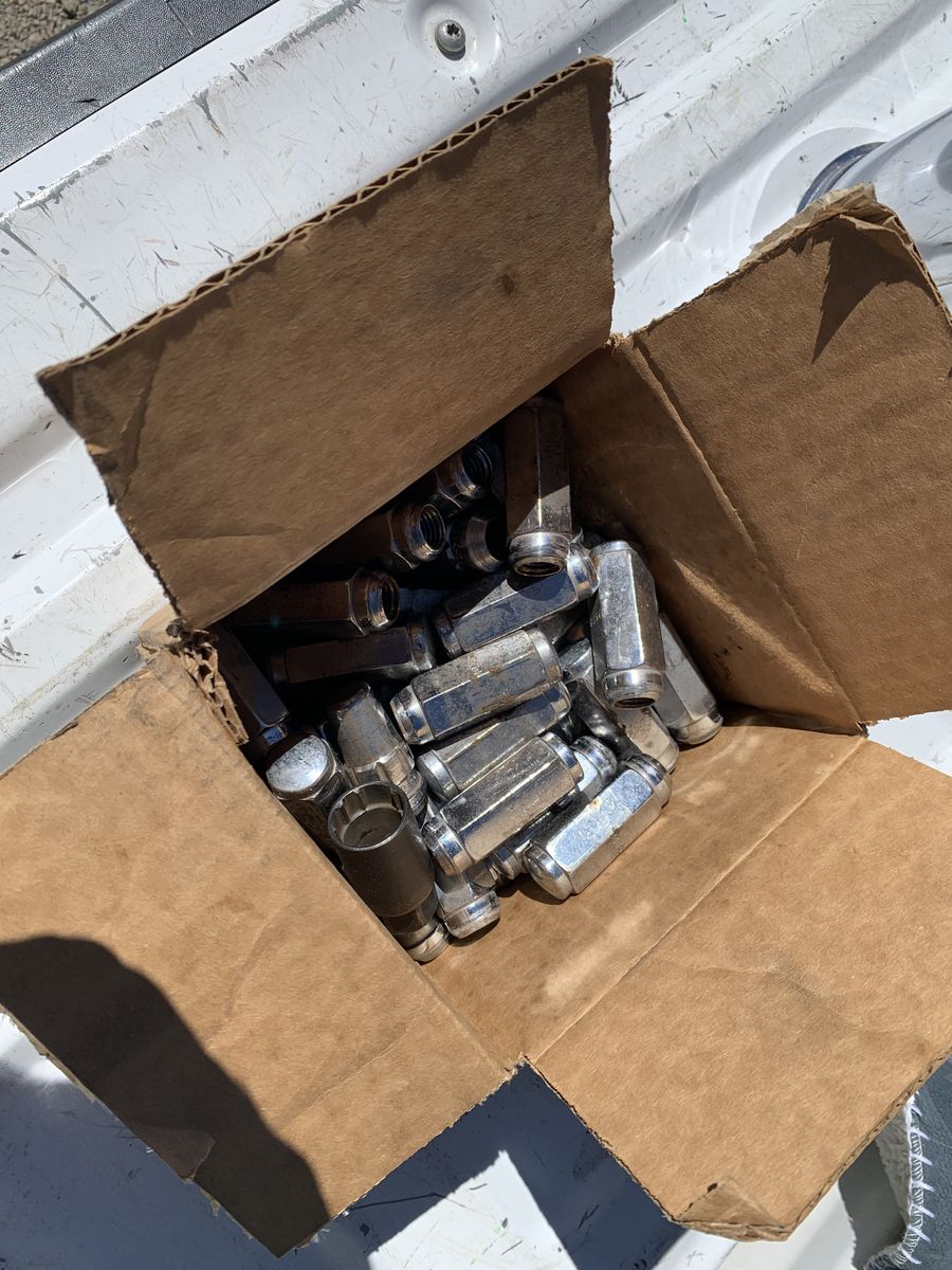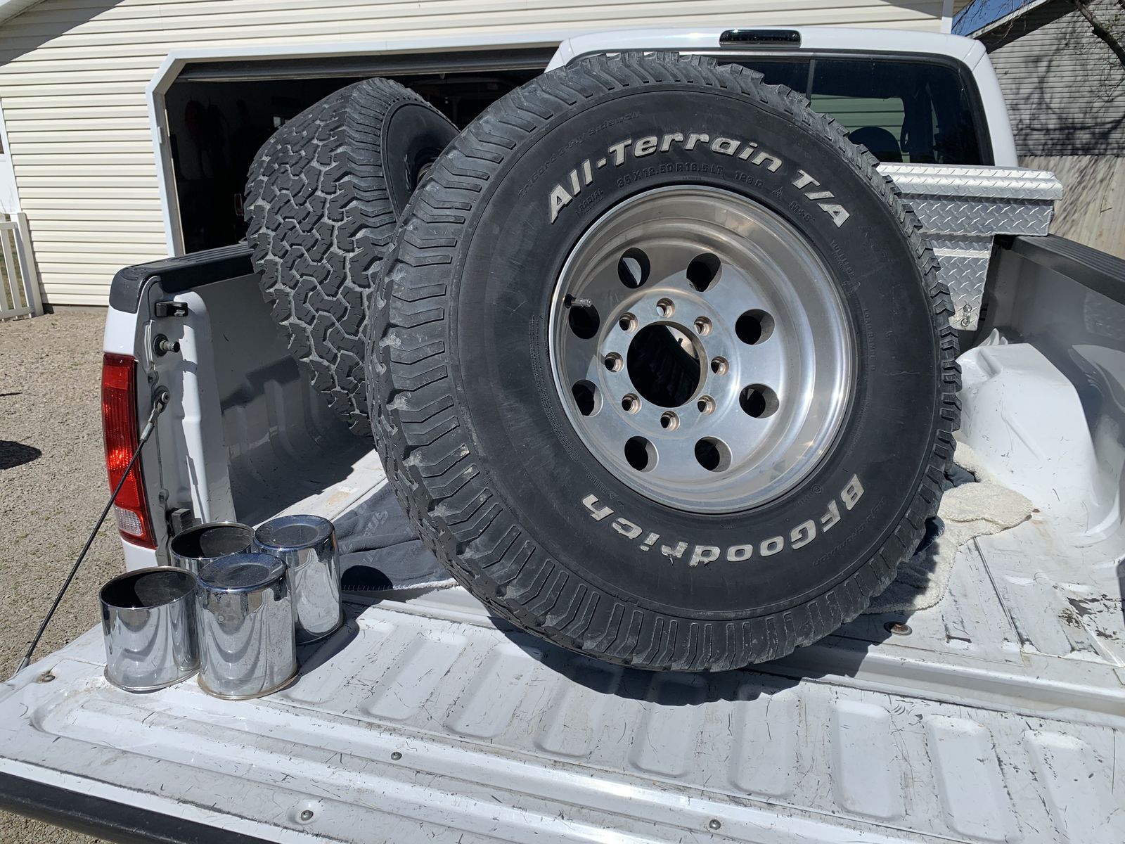 Set of 4 35 inch BFG all terrain tires with center caps and lug nuts. These came off of a 1999 Super Duty. 8 x 170 pattern, lugs are 14 x 2. Tires are old but hold air just fine. Wheels are in good shape.