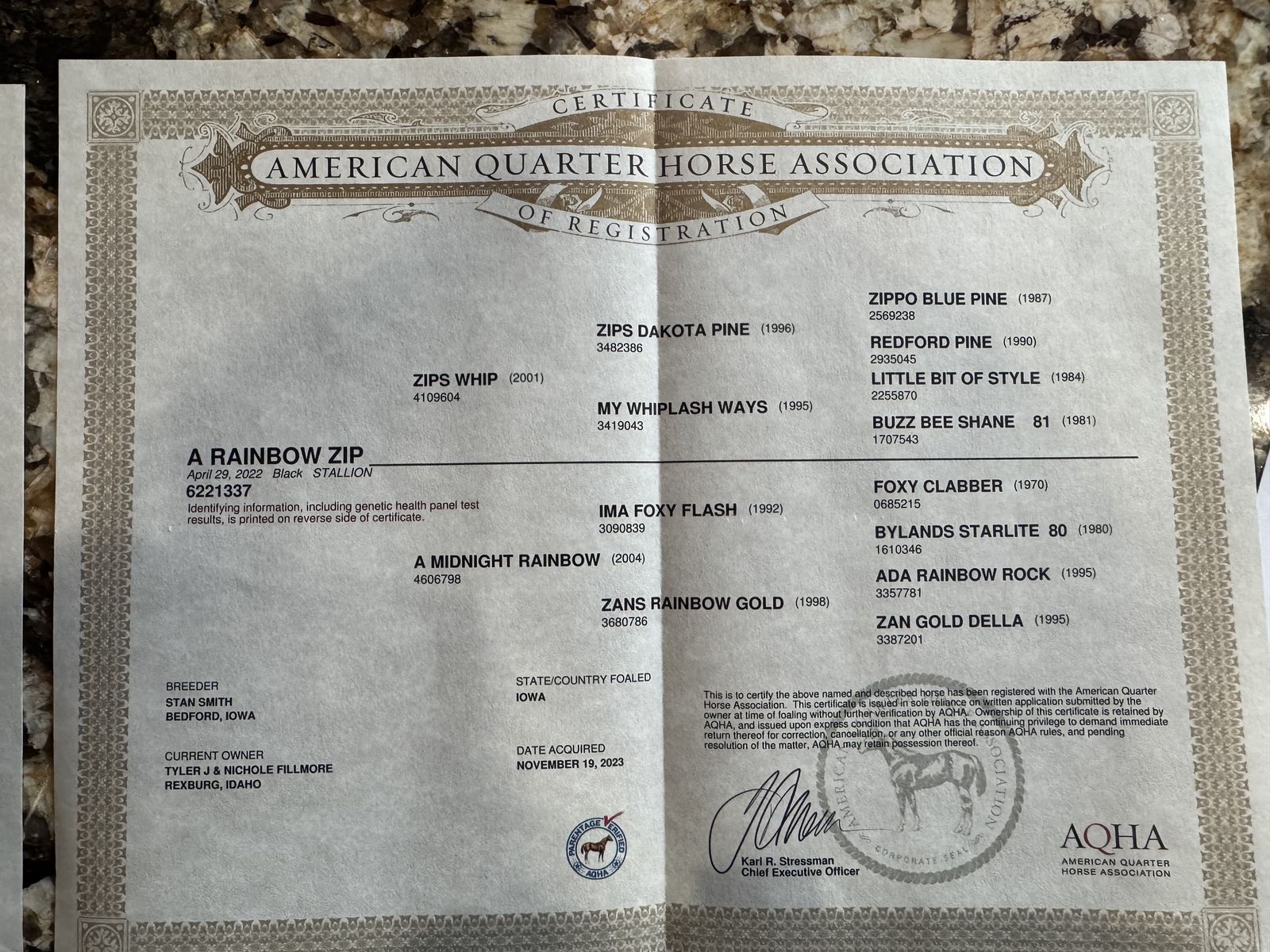 Venmo4 year old Pitzer ranch bred mare with colt. Easy breeder and great momma. Attached are the mares papers and the colts sire’s papers.