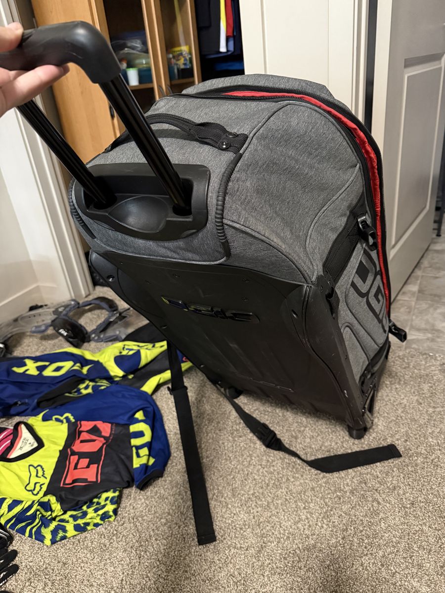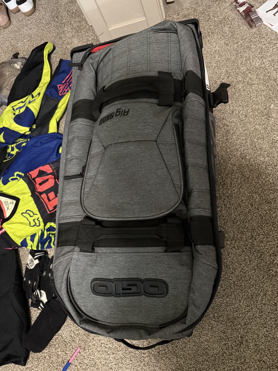 GMax Helmet - Size Small, Black with goggles, Extra thick padding, light wear. Ogio Rig R9800 Bag - Roller bag. Only been used in storage, BRAND new. Womens Riding Fox Outfit (Yellow/blue/animal Print) - Jersey is Medium, Pants are 5/6. Womens Riding Fox Jersey (Pink) - Jersey only, size small. Small Fox Gloves Fox Socks Protective undershirt with padding - S/M Apline Star Boots - I believe they are MENS 7s. Light wear. Women's Fox Chest Protector - It doesn't have a size listed, but I bet it's S/M