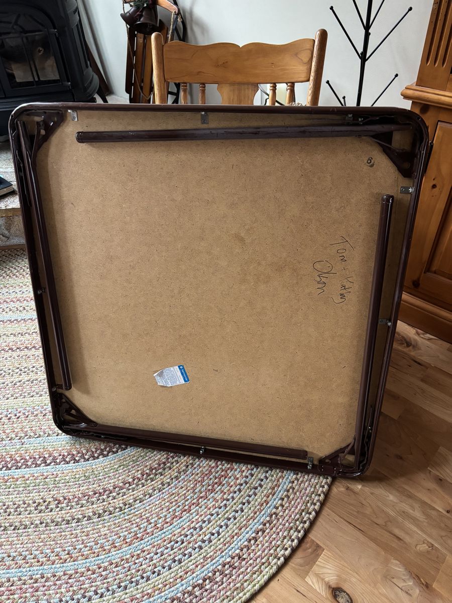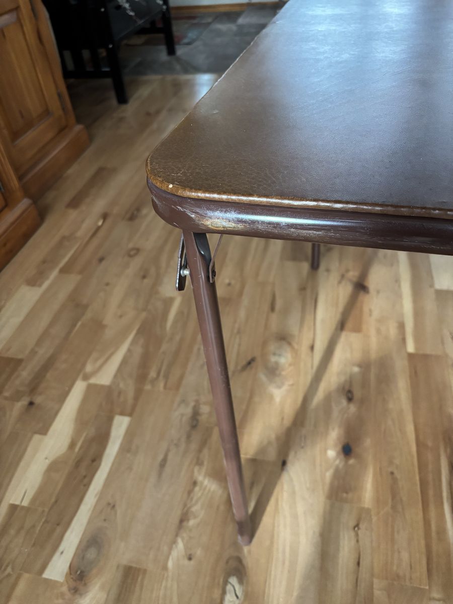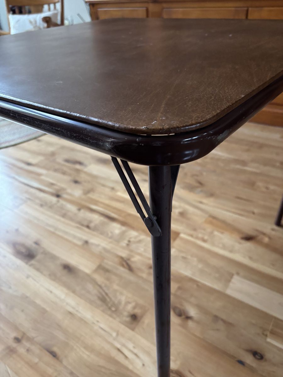 Samsonite brown metal card table for sale in good condition. Older construction with little use so legs are strong and sturdy. Some wear on the paint on the edges. Folds up for easy storage.