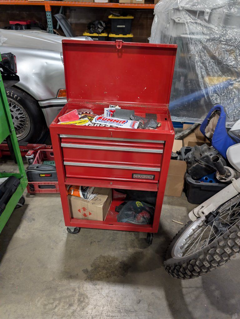 Small toolbox. Works great, just no longer needed. Top section, 3 drawers, and large storage space underneath. Lockable.