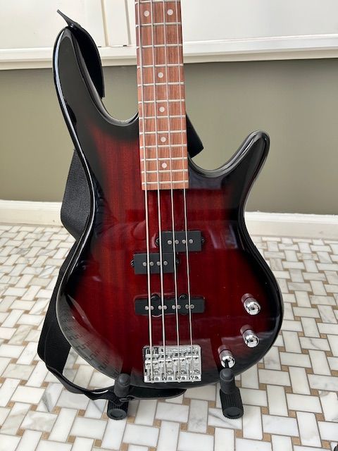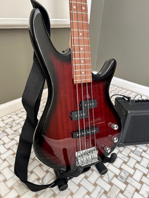 VenmoGreat begginers bass, light weight, low scale, 22 frets. Like new. Comes with mini bass amp and gig bag.