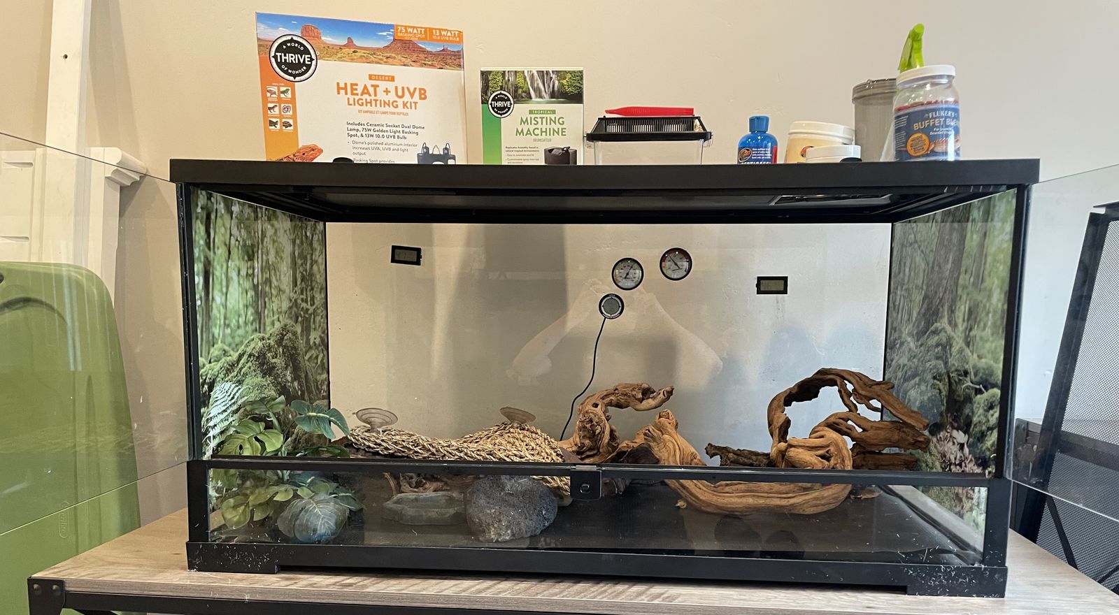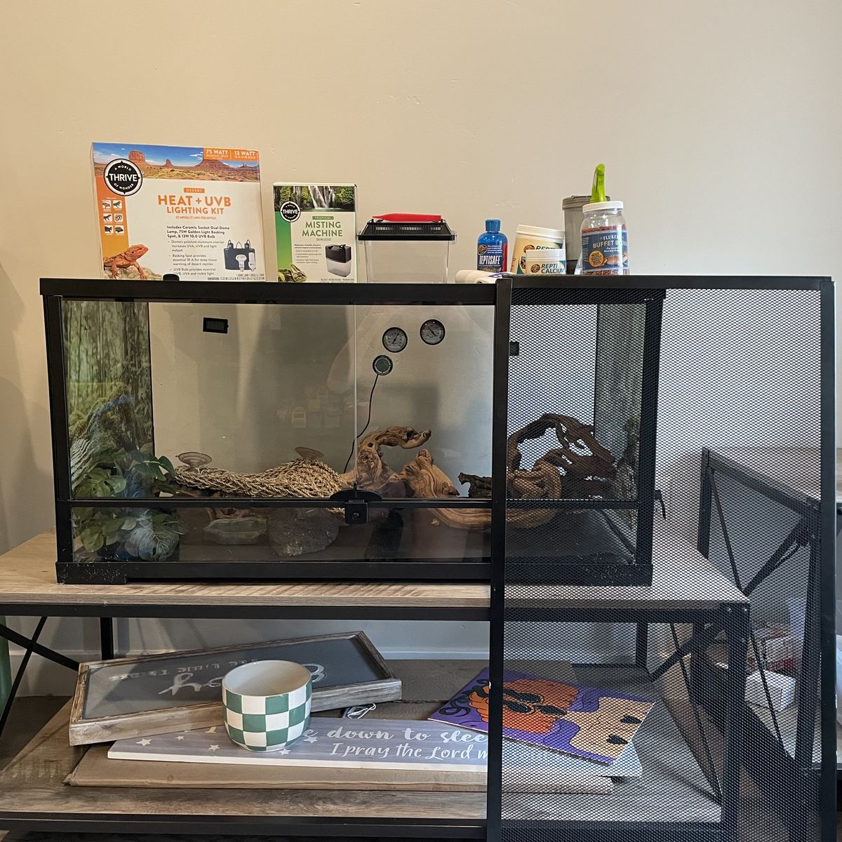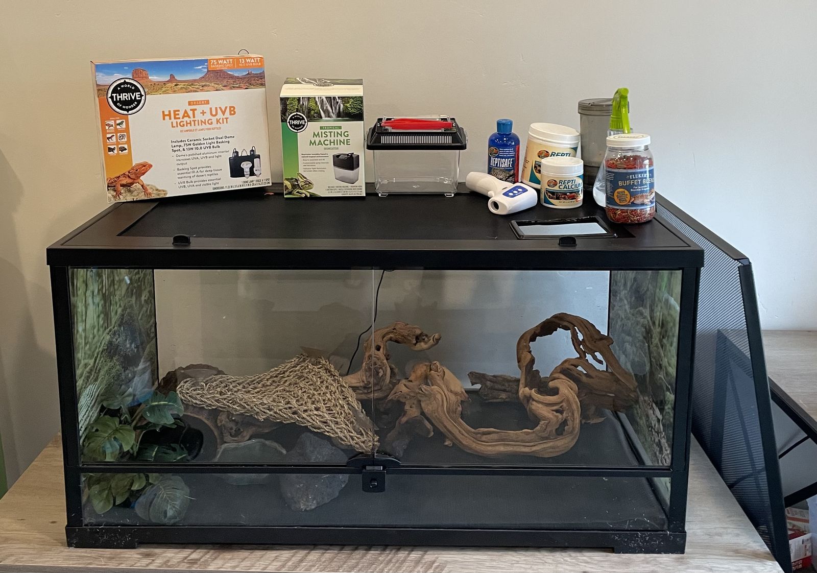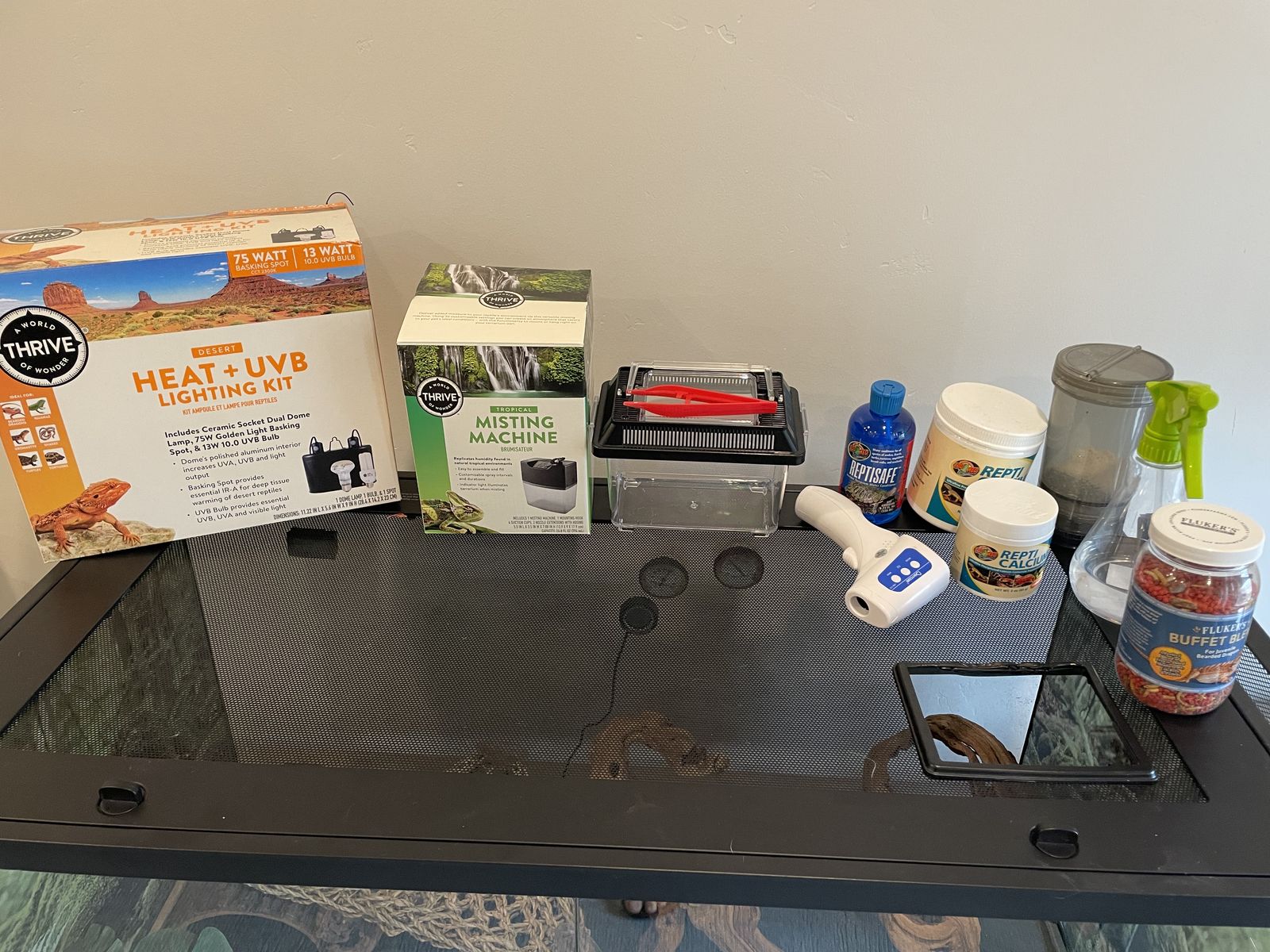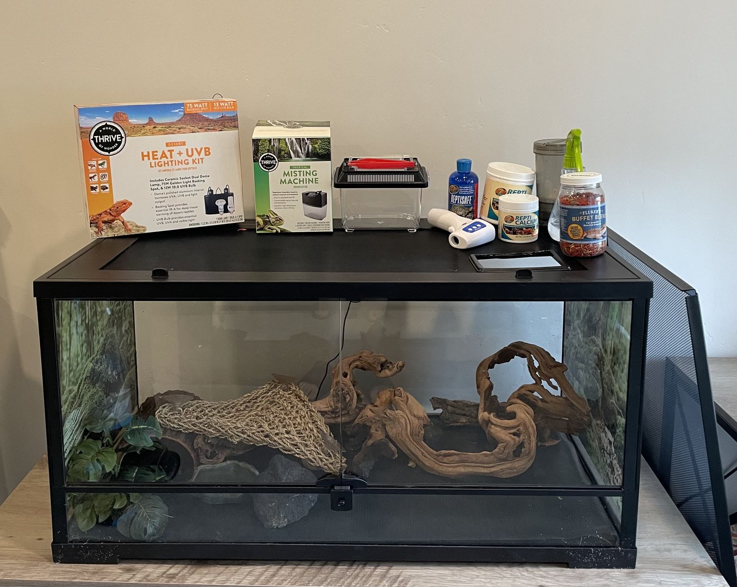40 gallon reptile enclosure with everything you see here witch includes . Heat lamp (with bulbs) . Automatic mister . Insect keeper for feeding . Calcium powder and calcium powder shaker . Spray bottle for misting . Reptile water for feeding . Food . Rocks and wood and hiding decorations and plants for enclosure