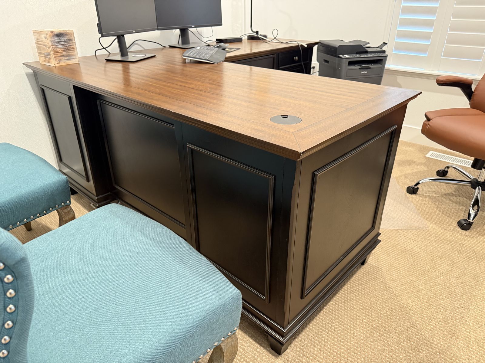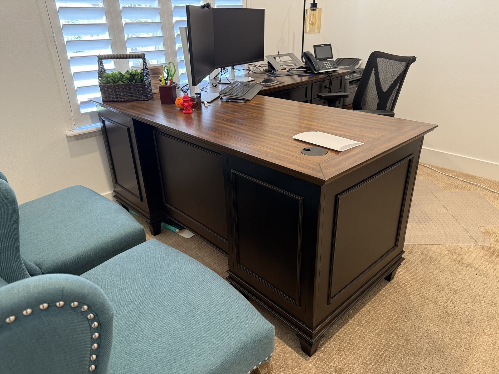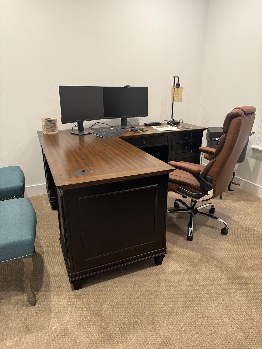 PayPalPREMIUM HOME OFFICE FURNITURE SET – Martin Furniture Hartford Collection Upgrading your office? Don’t miss this rare opportunity to grab a complete executive office setup at a fraction of retail price. All pieces are in excellent, lightly used condition — mostly kept in storage. ITEMS AVAILABLE (sell separately or as a set): • 3 Hartford Wood L-Desk with Return (Black) – IMHF684R-Kit | Retail: $2,598 • 1 Hartford Wood Credenza + Hutch with Wire Mesh Doors (Black) – IMHF689_682 | Retail: $2,795 • 3 Dark leather executive chair with nailhead trim • 1 Dark leather loveseat with nailhead trim • 6 teal accent/client chairs