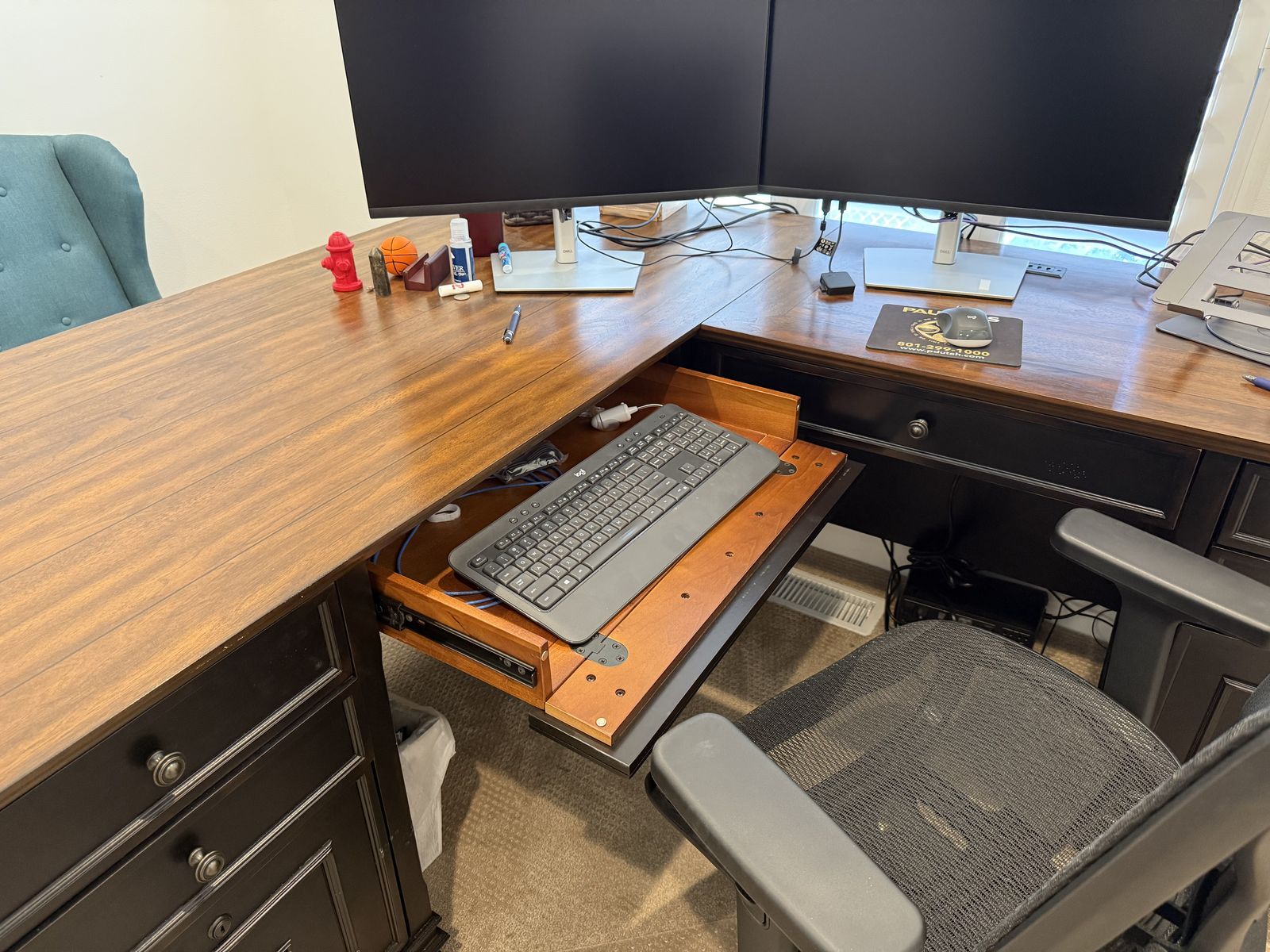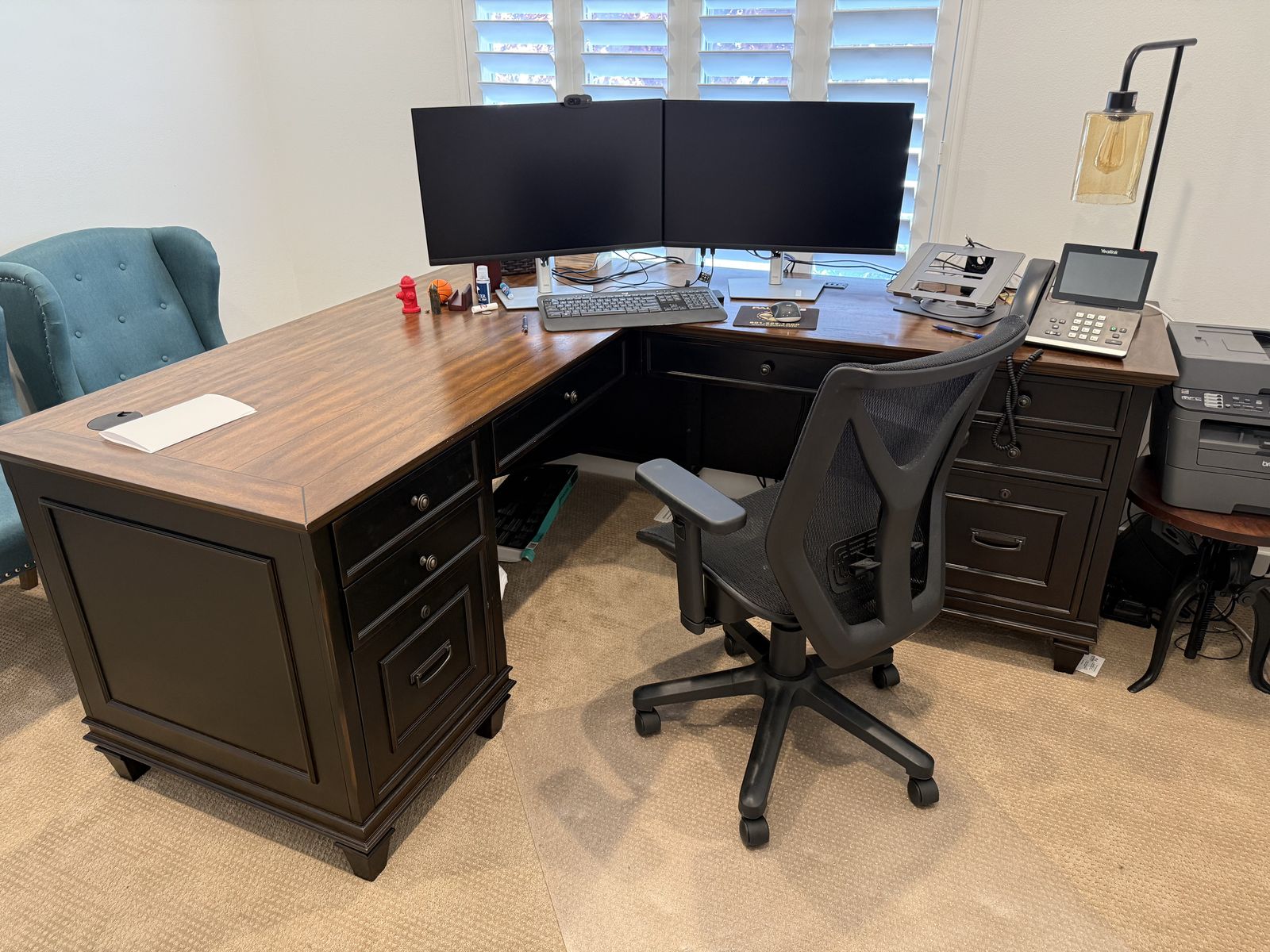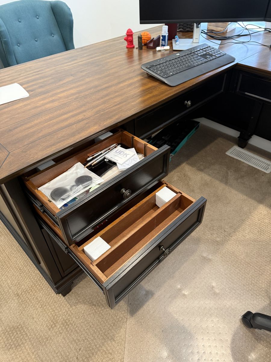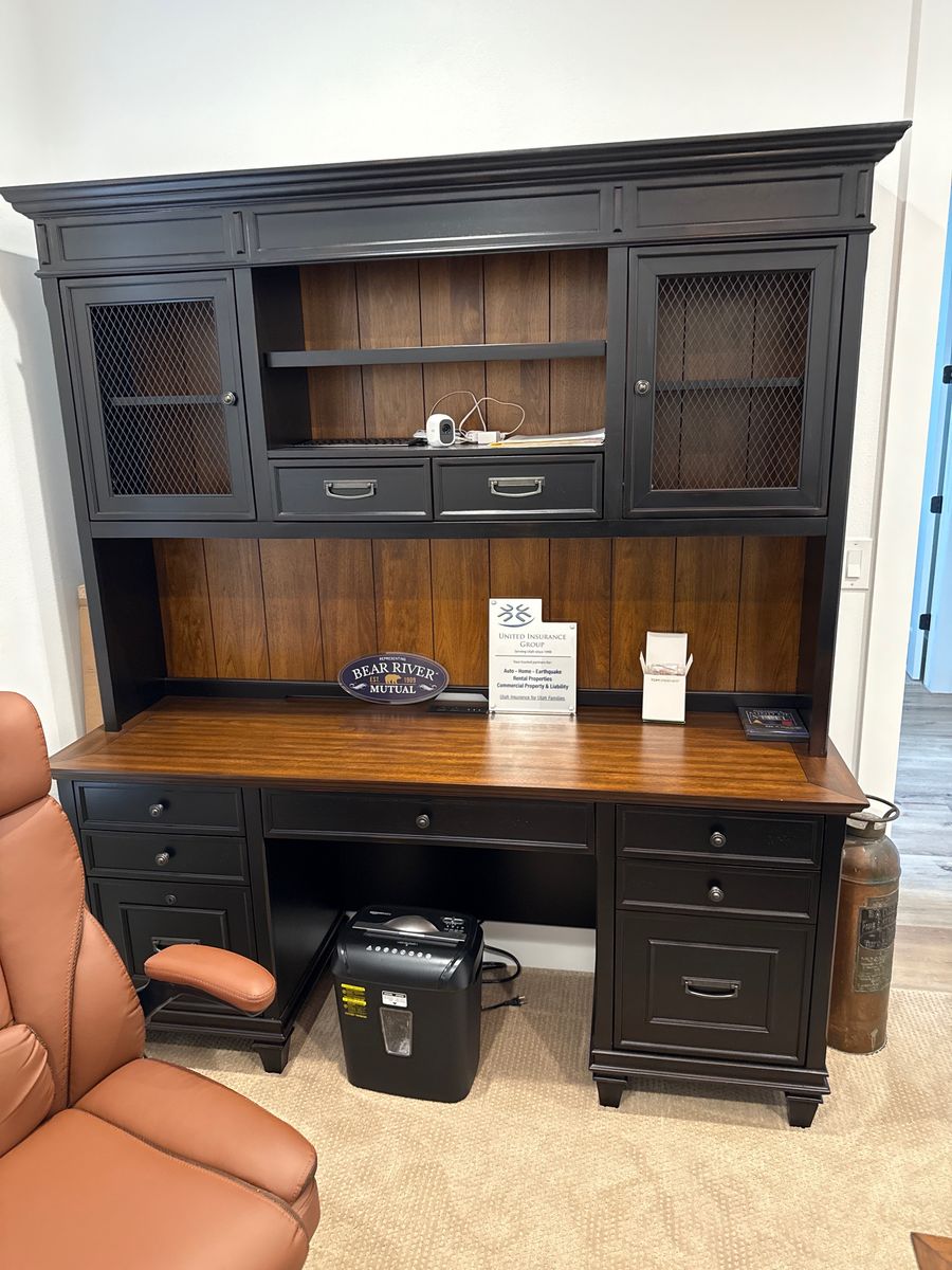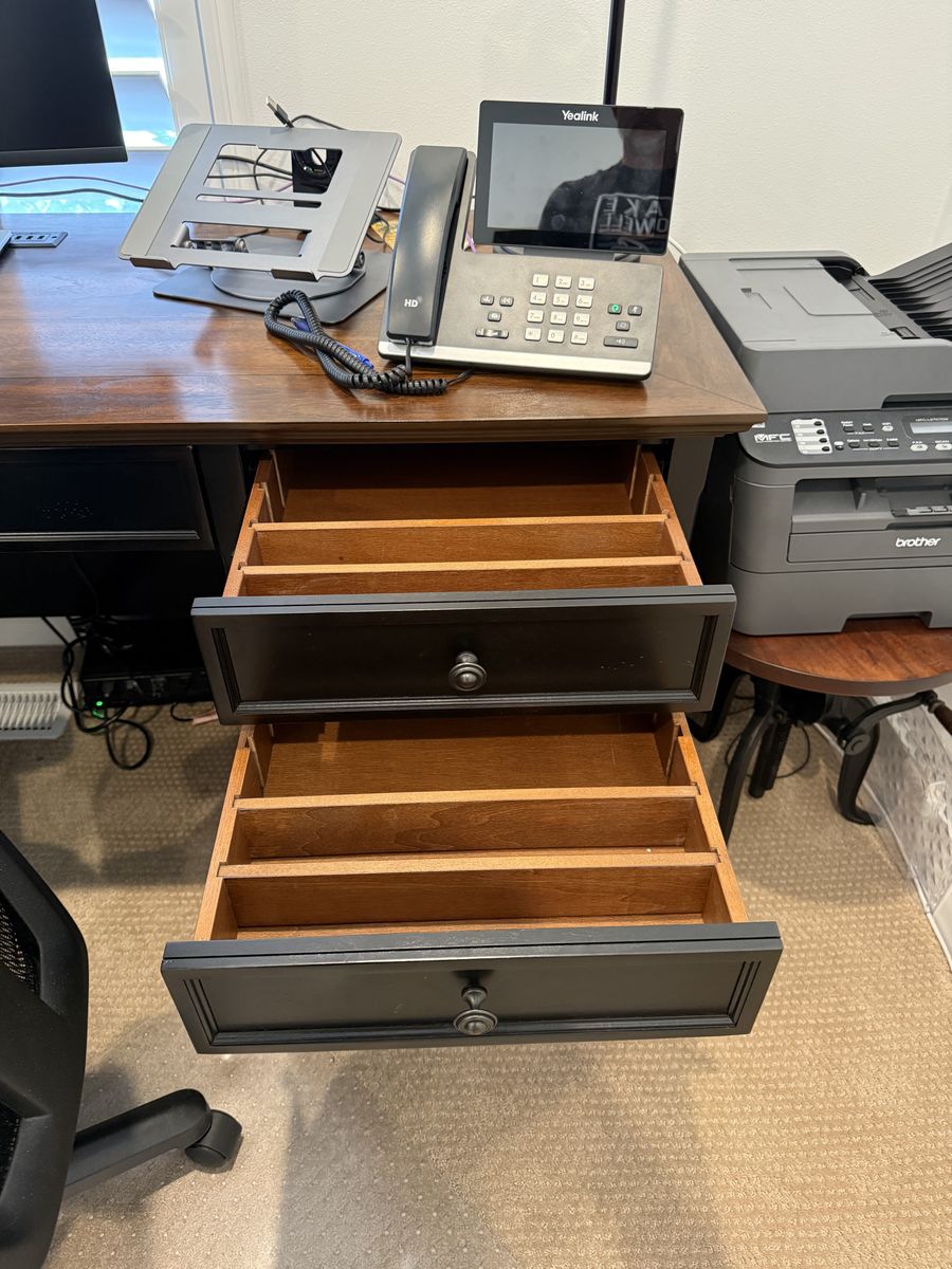All pieces match – same Hartford Black collection Lightly used, mostly in storage Solid wood construction with walnut top finish Built-in power outlets, keyboard trays, file drawers, and wire management