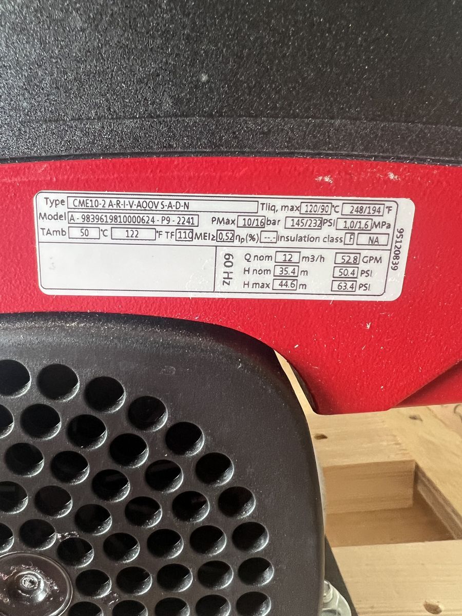 VenmoBrand New, never used Grundfos 99329882, CME 10-2, CME Series, Multistage Centrifugal Pump, 3 HP, 440-480 Volts, 3 Phase, 1-1/2" NPT Suction, 1-1/2" NPT Discharge, AQQV Shaft Seal, Cast Iron Housing, 52.8 GPM Rated Flow, 128 ft Rated Head.
