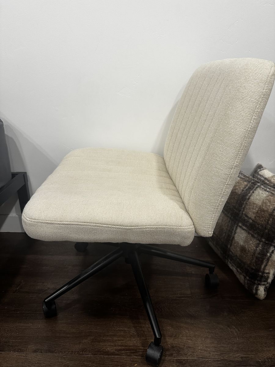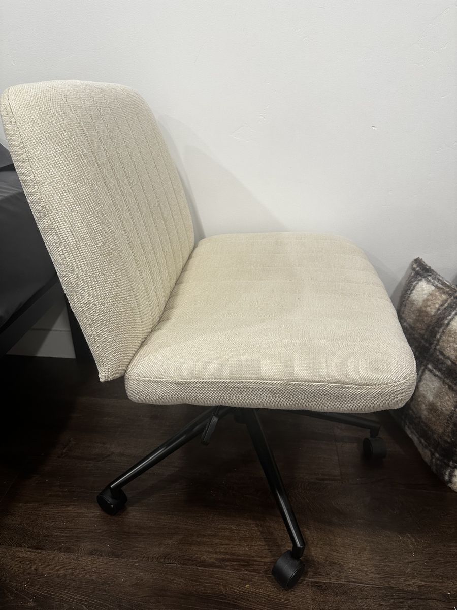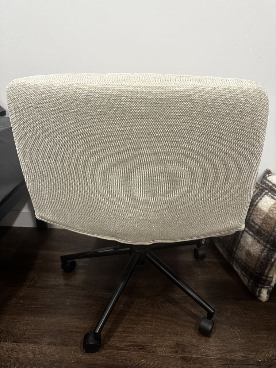 ApplePayClean and comfortable rolling desk chair in great condition. Neutral beige color fits easily with any setup. Lightweight and easy to move around, perfect for a home office, bedroom desk, or small space.