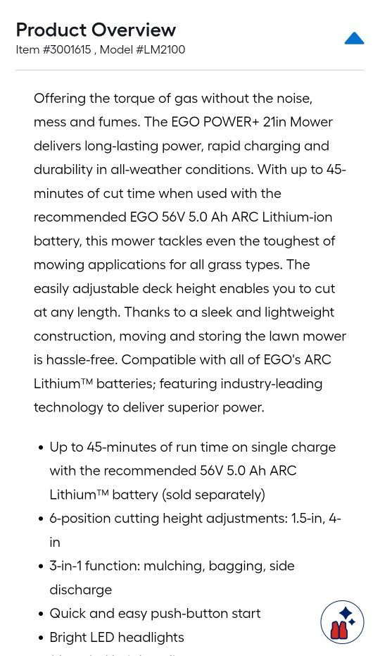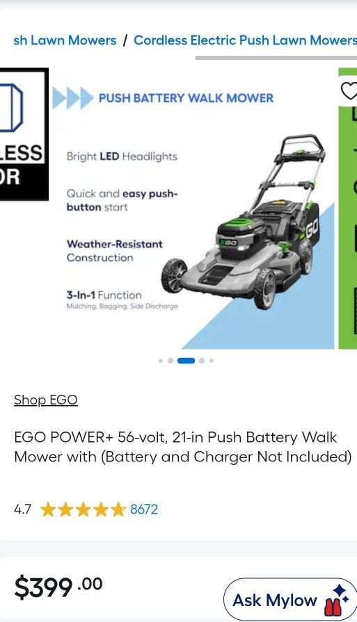 Powerful EGO Power+ 56-volt 21-inch cordless lawn mower, model LM2100. THIS ONE COMES WITH THE BATTERY AND CHARGER, so you're all set to go!!!!! Has easy push-button start, bright LED headlights, and weather-resistant build. Plus, it's a 3-in-1 for mulching, bagging, or side discharge. It's a push start mower so very easy to start!! It's clean and ready for your yard!