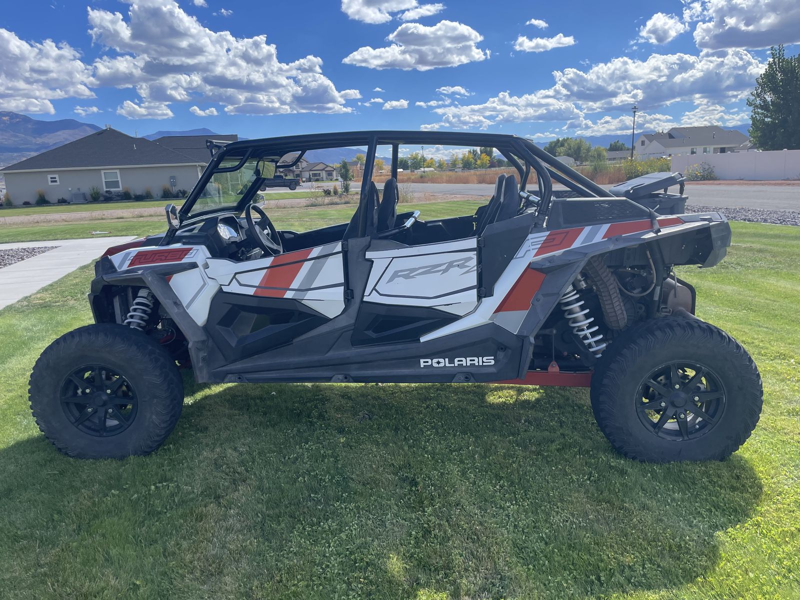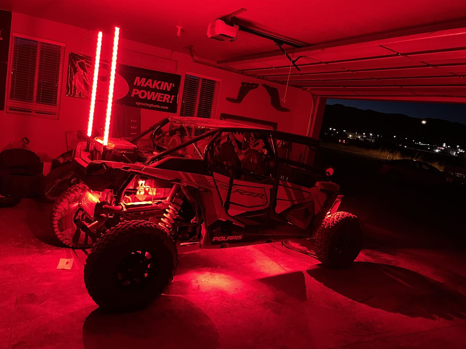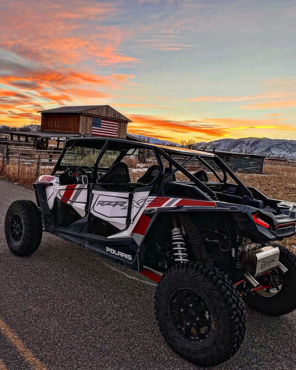 Hindenburg cage in tuxedo black PRP harnesses Light bar Assault mirrors MP door speakers Revolution Off-road exhaust Aftermarket blow off valve Tusk dual LED whip lights
