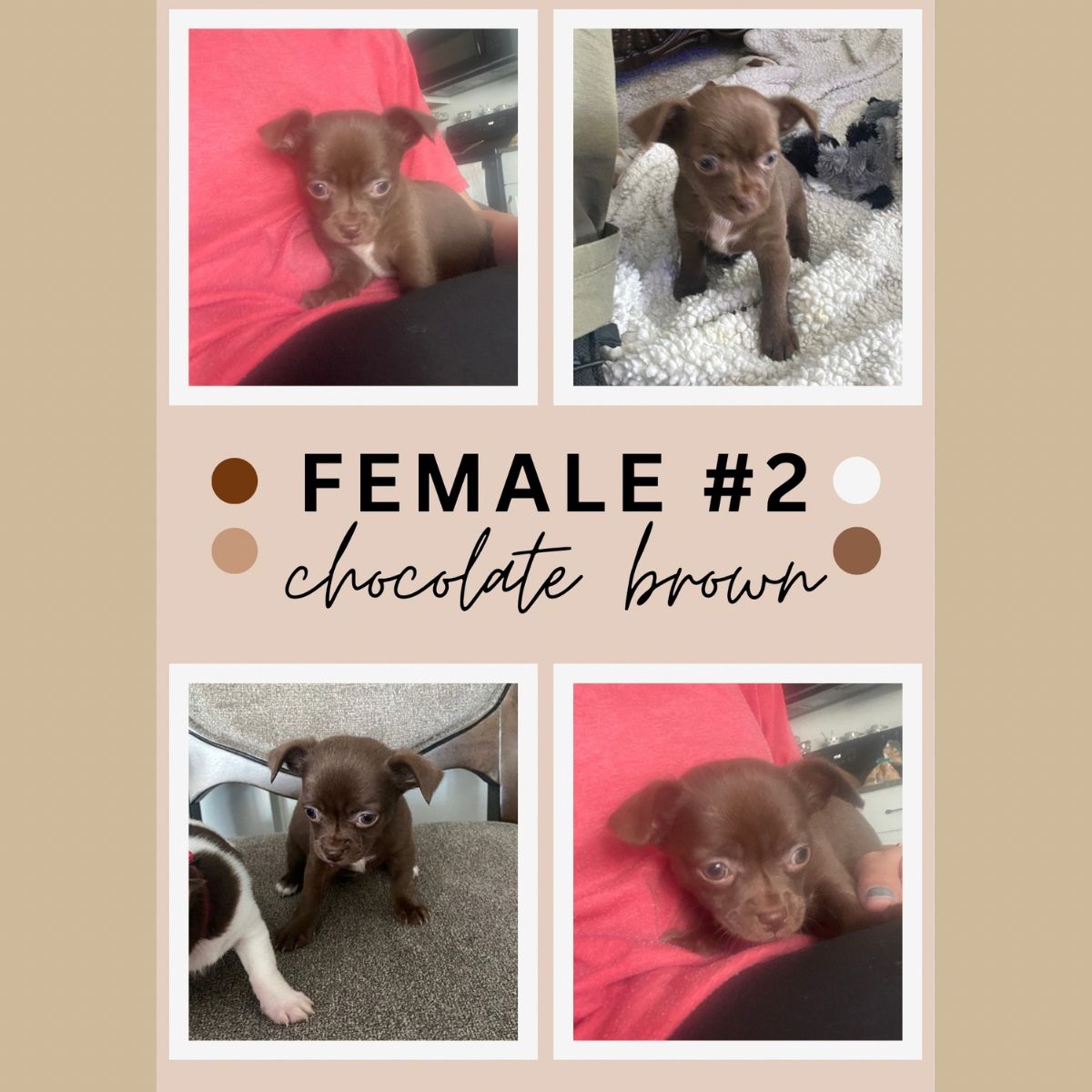 Female 1: SOLD Female 2: Chocolate brown, and white Male: SOLD