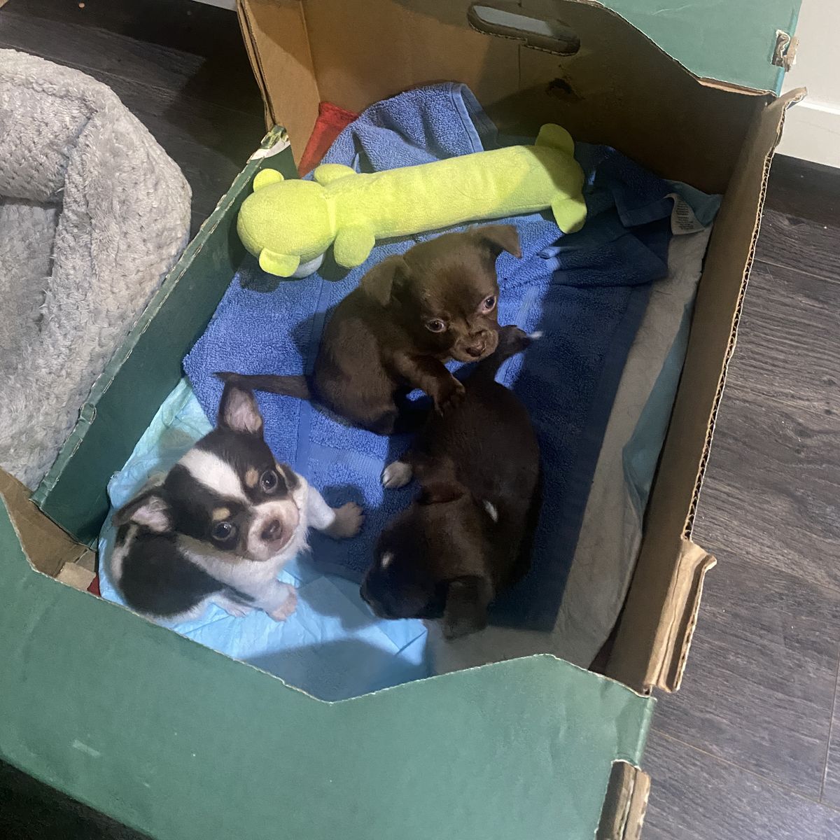 Mom: beige and white deer head. She weighs six to pounds. Dad: AKC blue and white apple head. He’s almost four pounds.