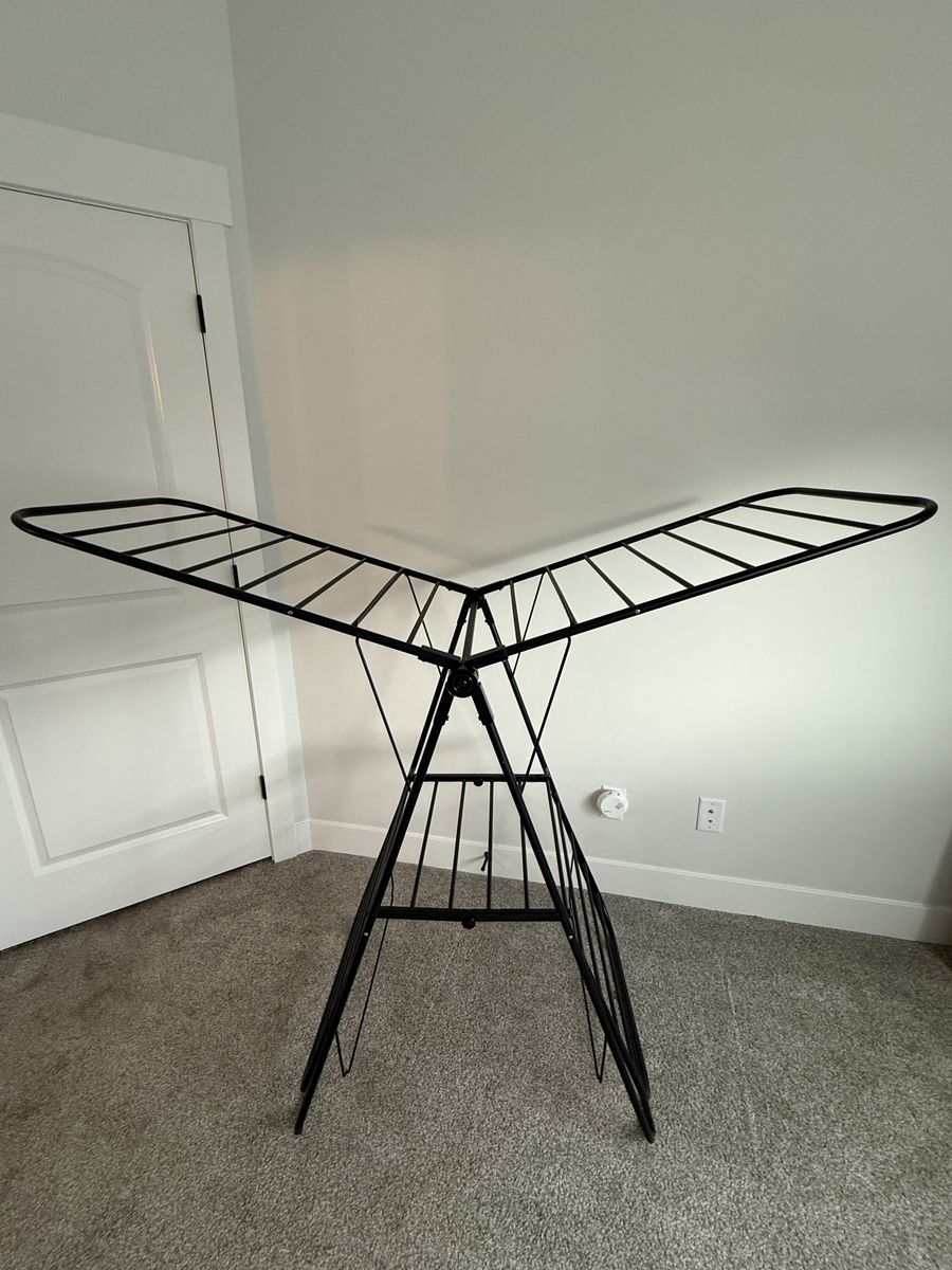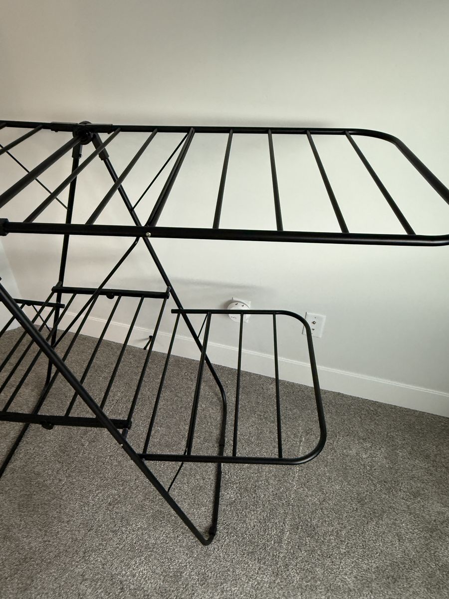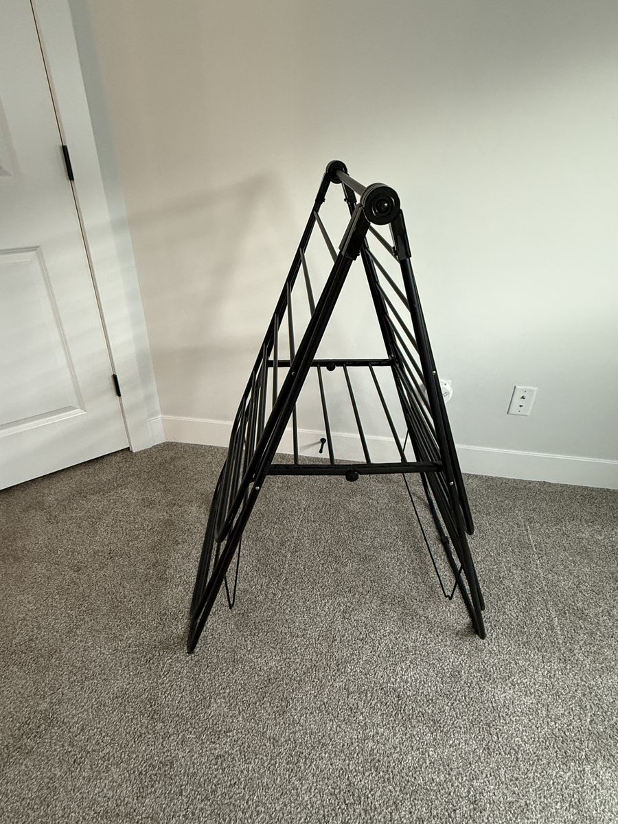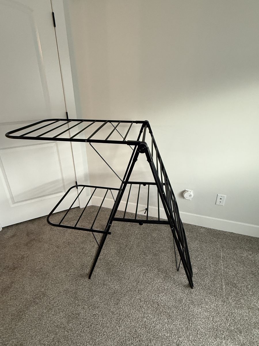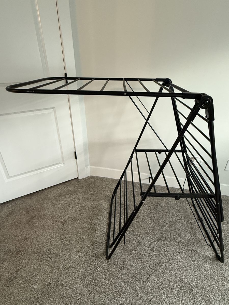 VenmoBlack clothes rack. Folds into several different configurations to suit various drying needs. Folds up to 2.8” wide for easy storage. Dimensions: 21.7"D x 58.3"W x 39.4"H. Weighs 6 pounds. 55 pound weight capacity.