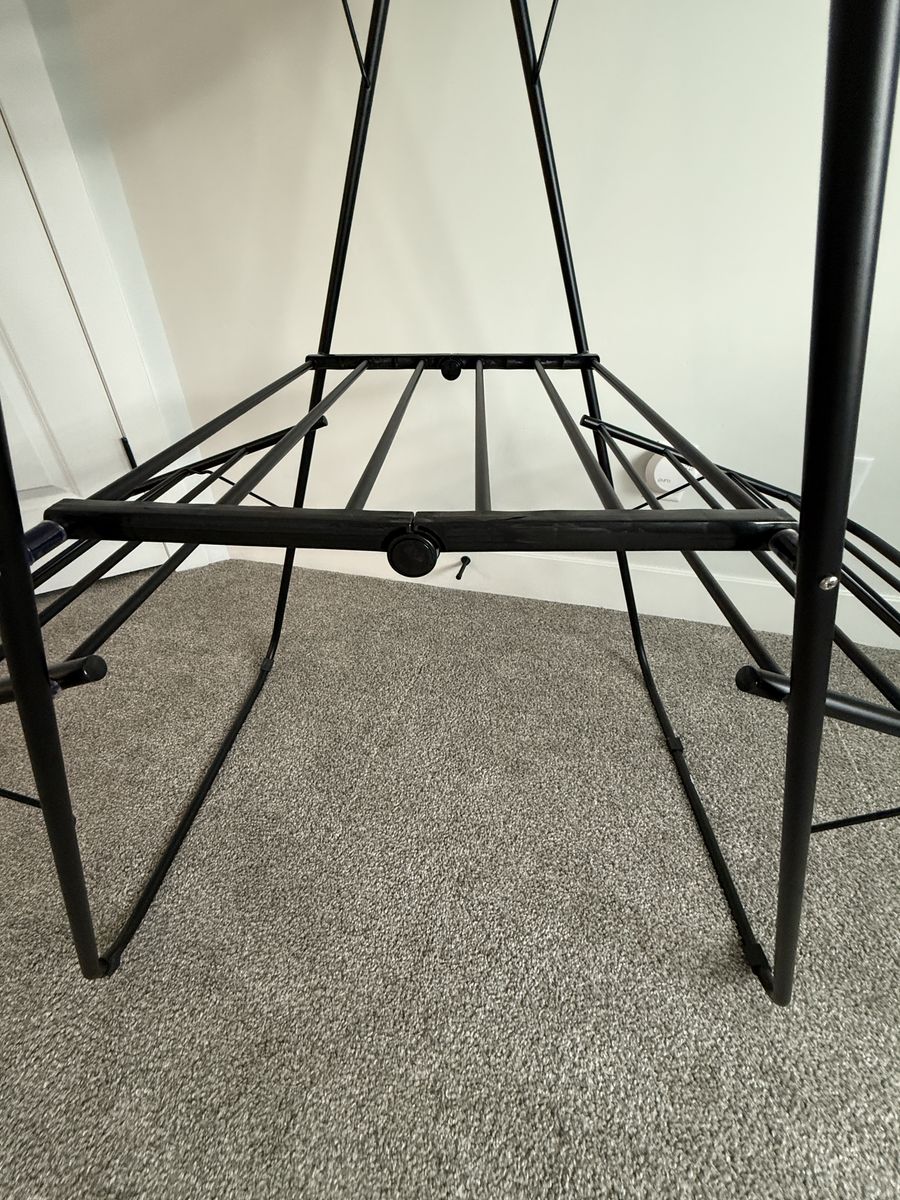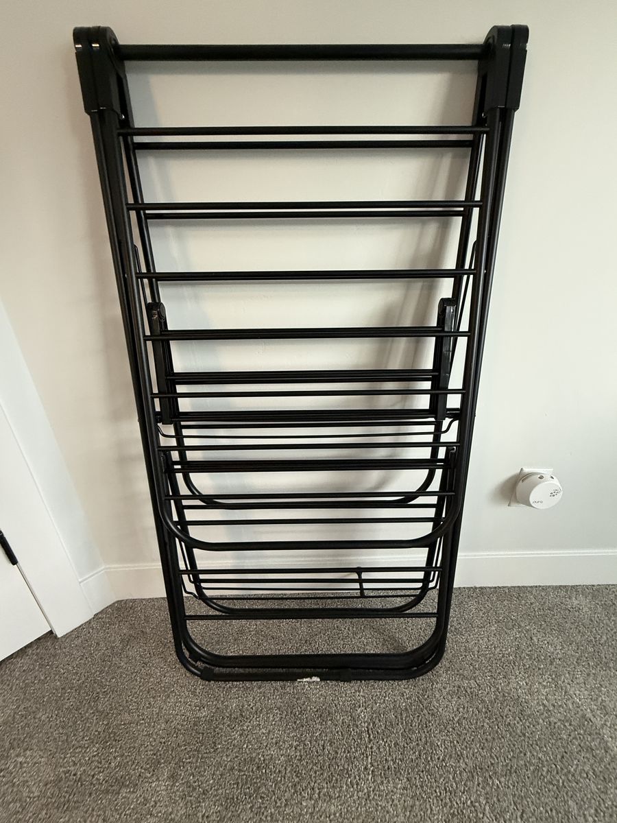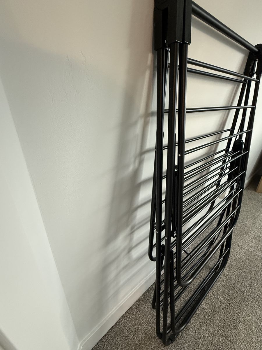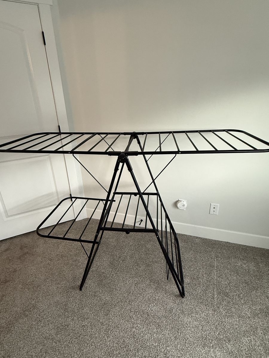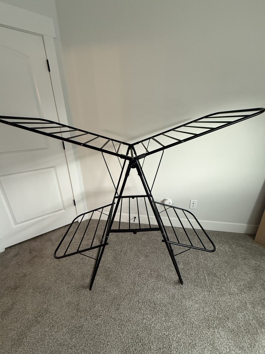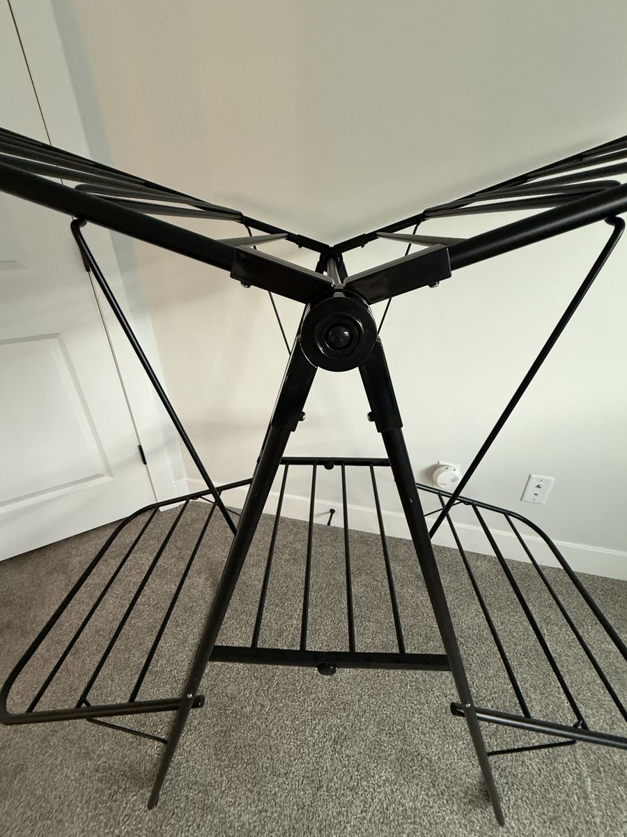 VenmoBlack clothes rack. Folds into several different configurations to suit various drying needs. Folds up to 2.8” wide for easy storage. Dimensions: 21.7"D x 58.3"W x 39.4"H. Weighs 6 pounds. 55 pound weight capacity.