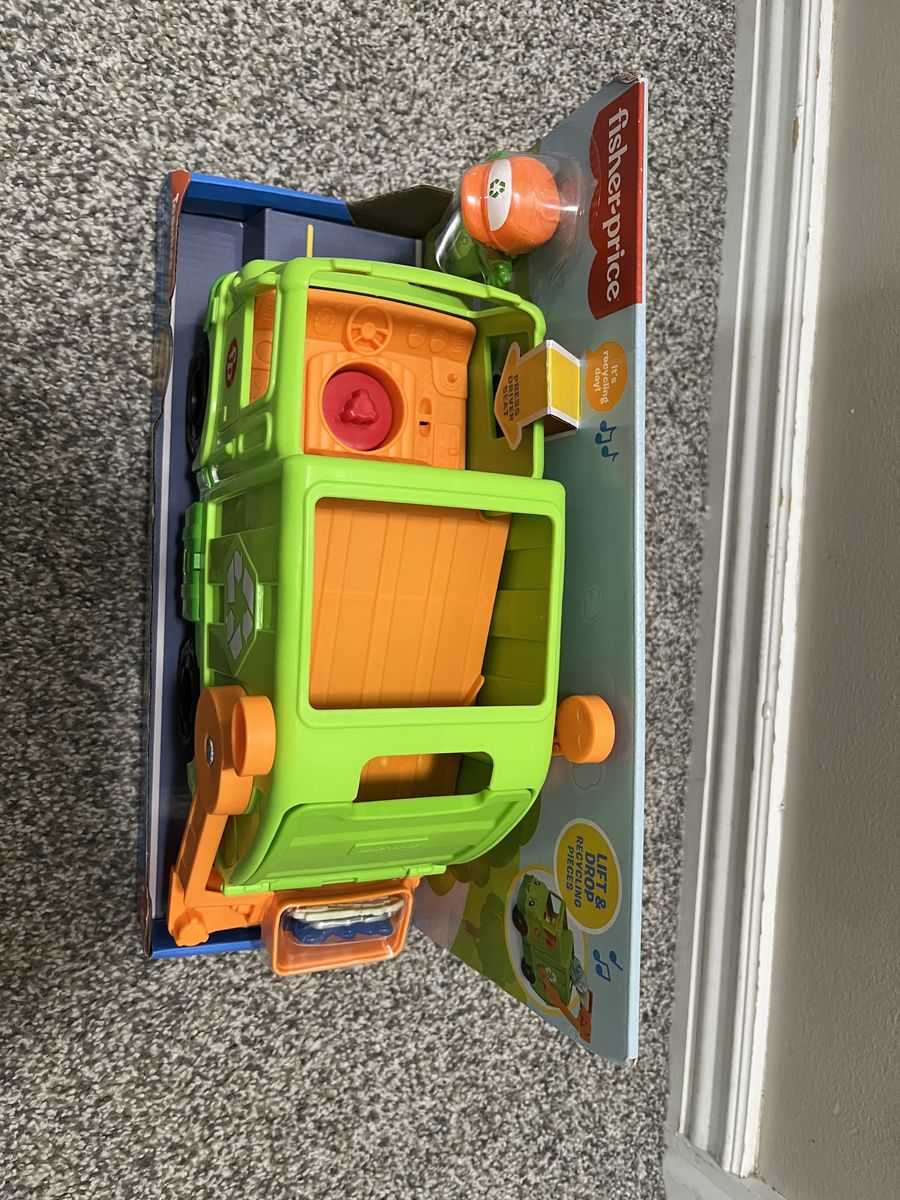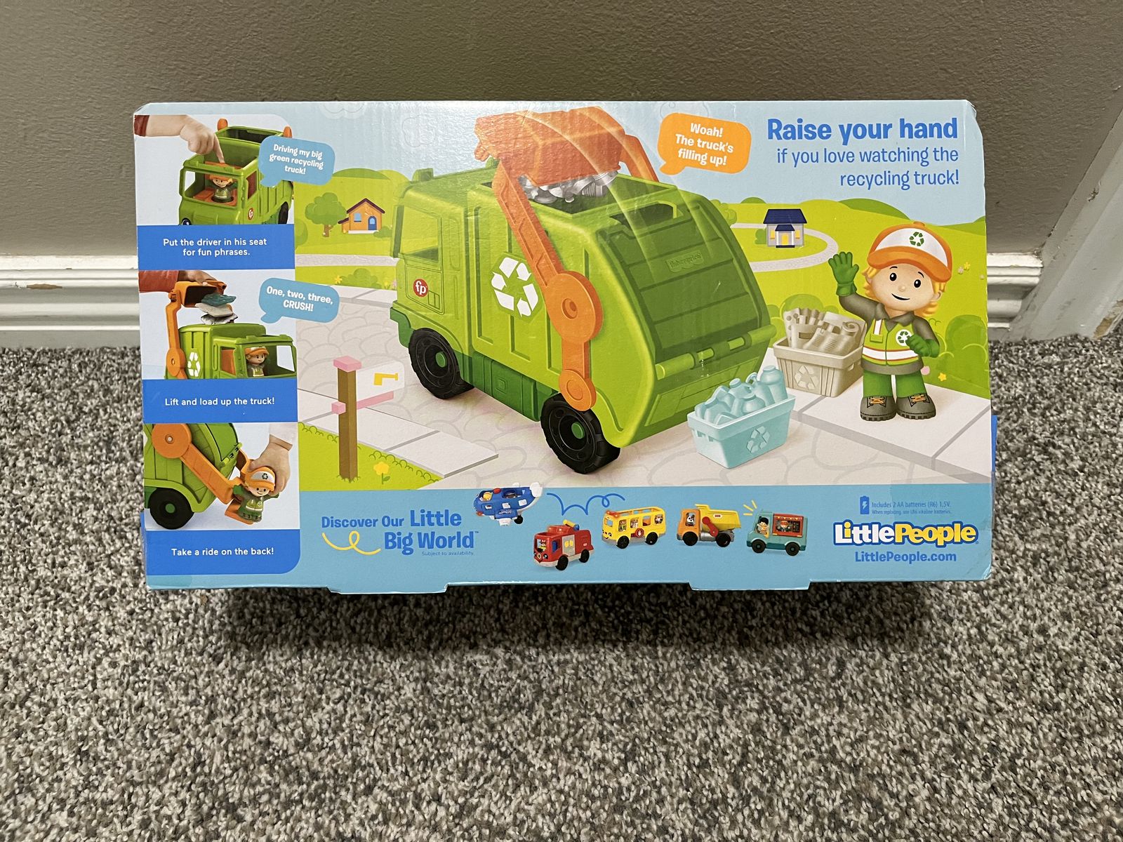 Brand new, never been opened. Fisher Price recycling truck, comes with pretend recyclables and a trash collector. Makes sounds and music.