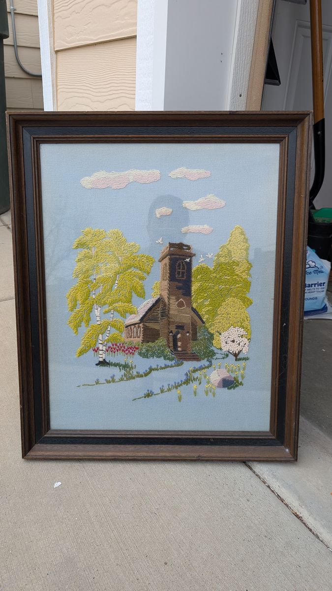 VenmoLovely, large framed embroidery of a school house. Poem attached to the back. Piece is 16" x 20". Smoke free home. We have a dog and a cat. Pick up in the Avenues.