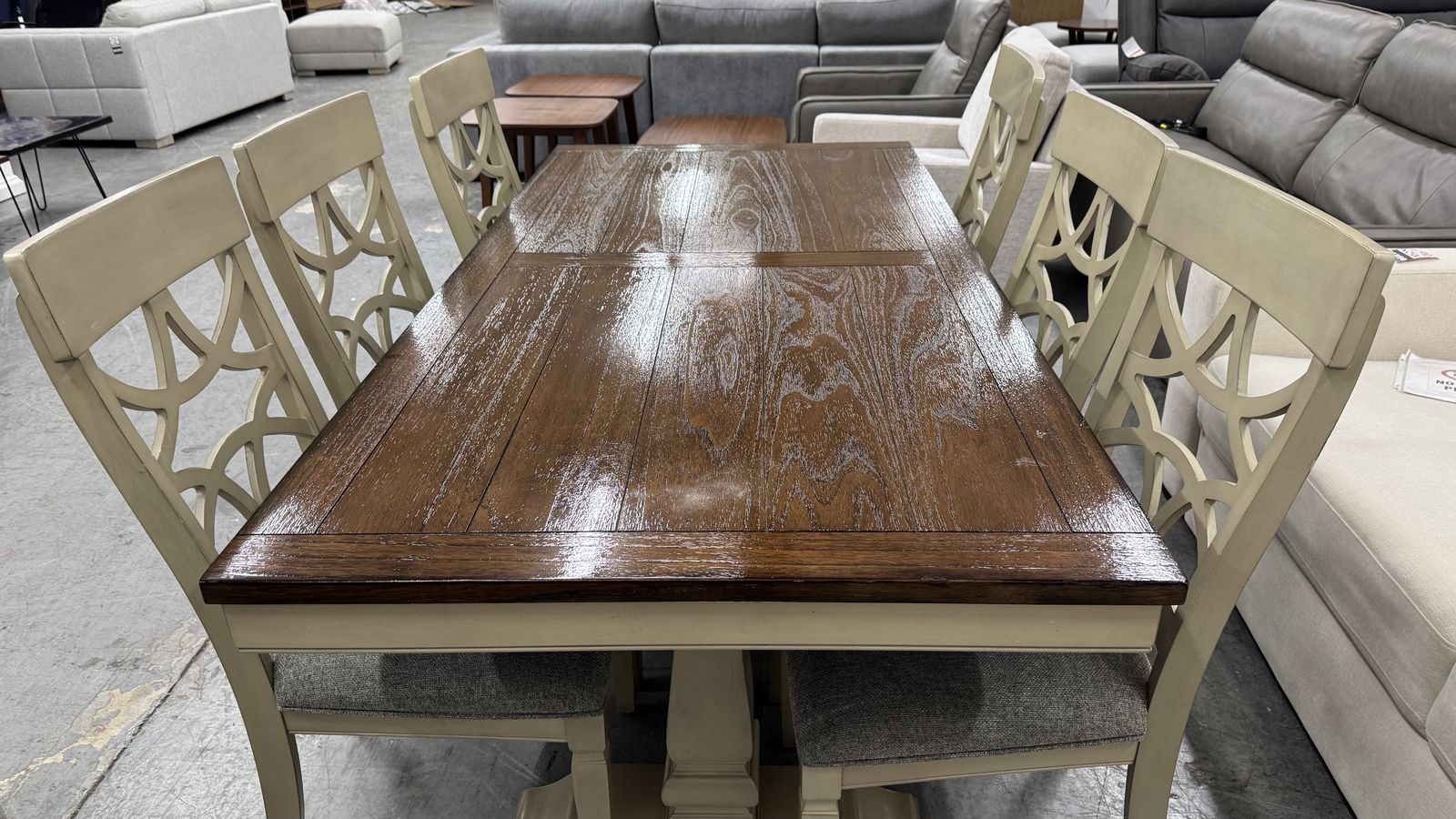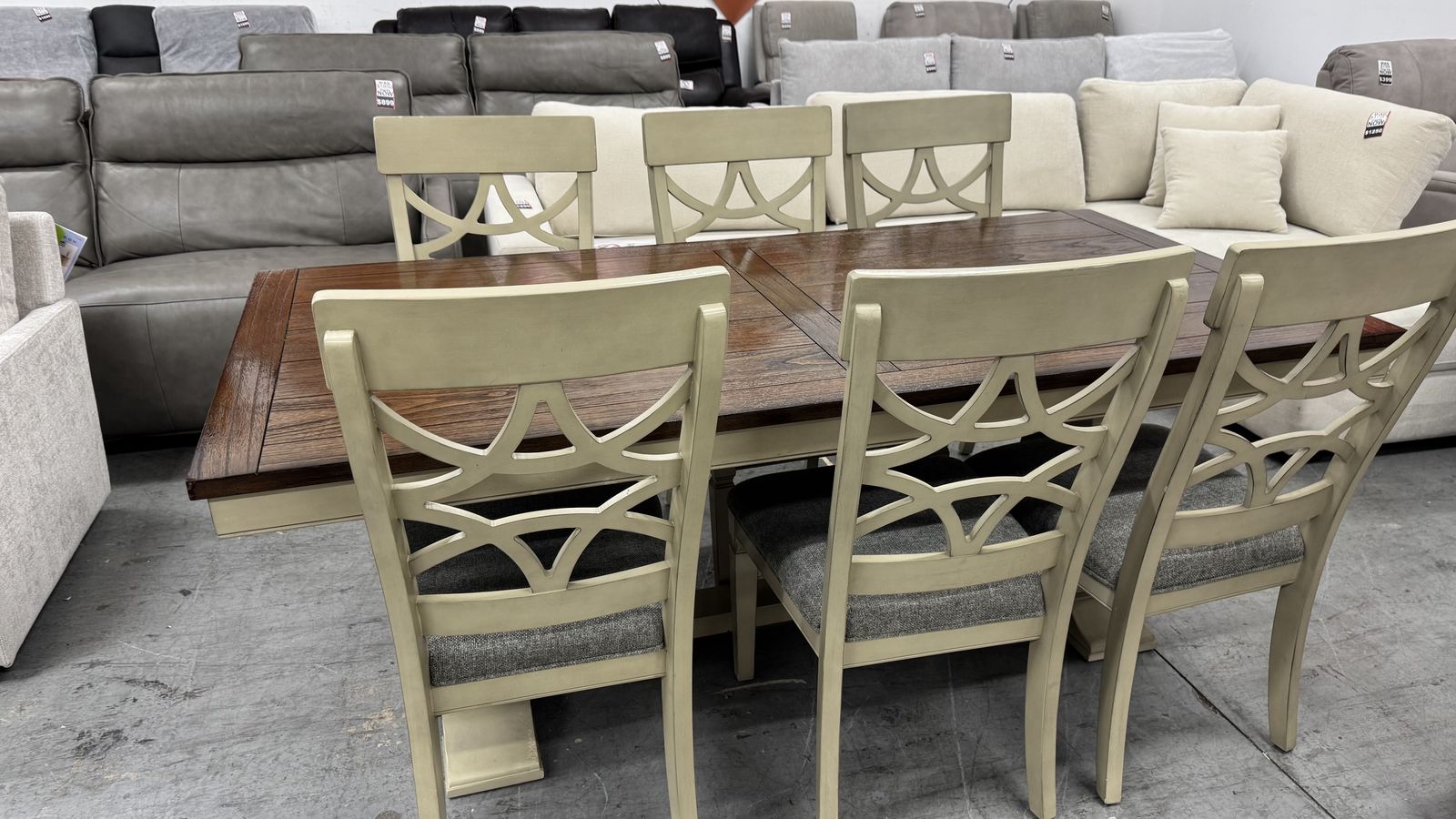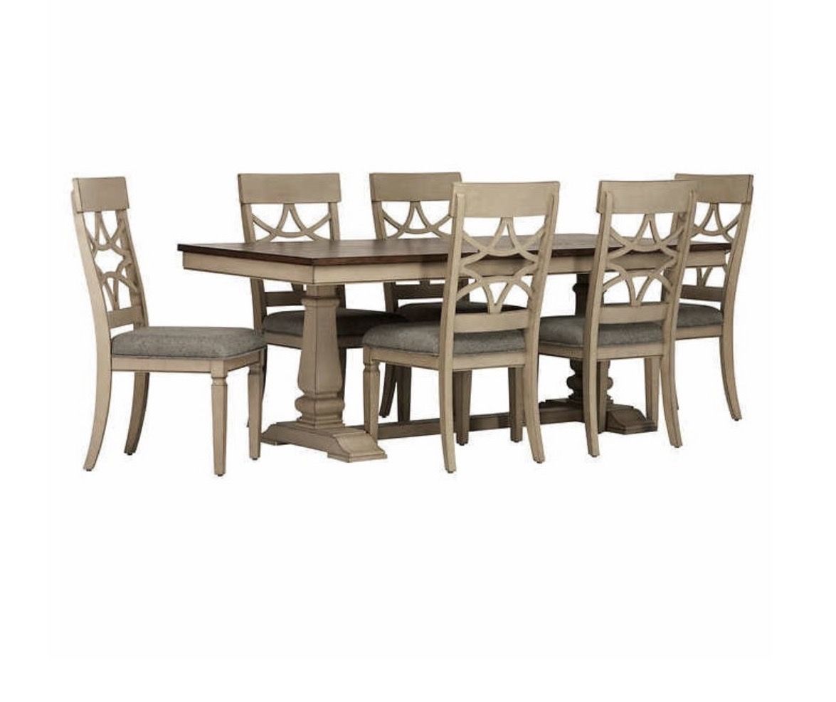 Mahogany solids and mindi veneers Stain resistant fabric Adjustable levellers Hand distressed finish Assembly required Includes: 1 table and 6 chairs Specifications: