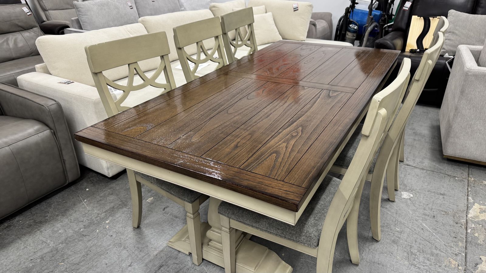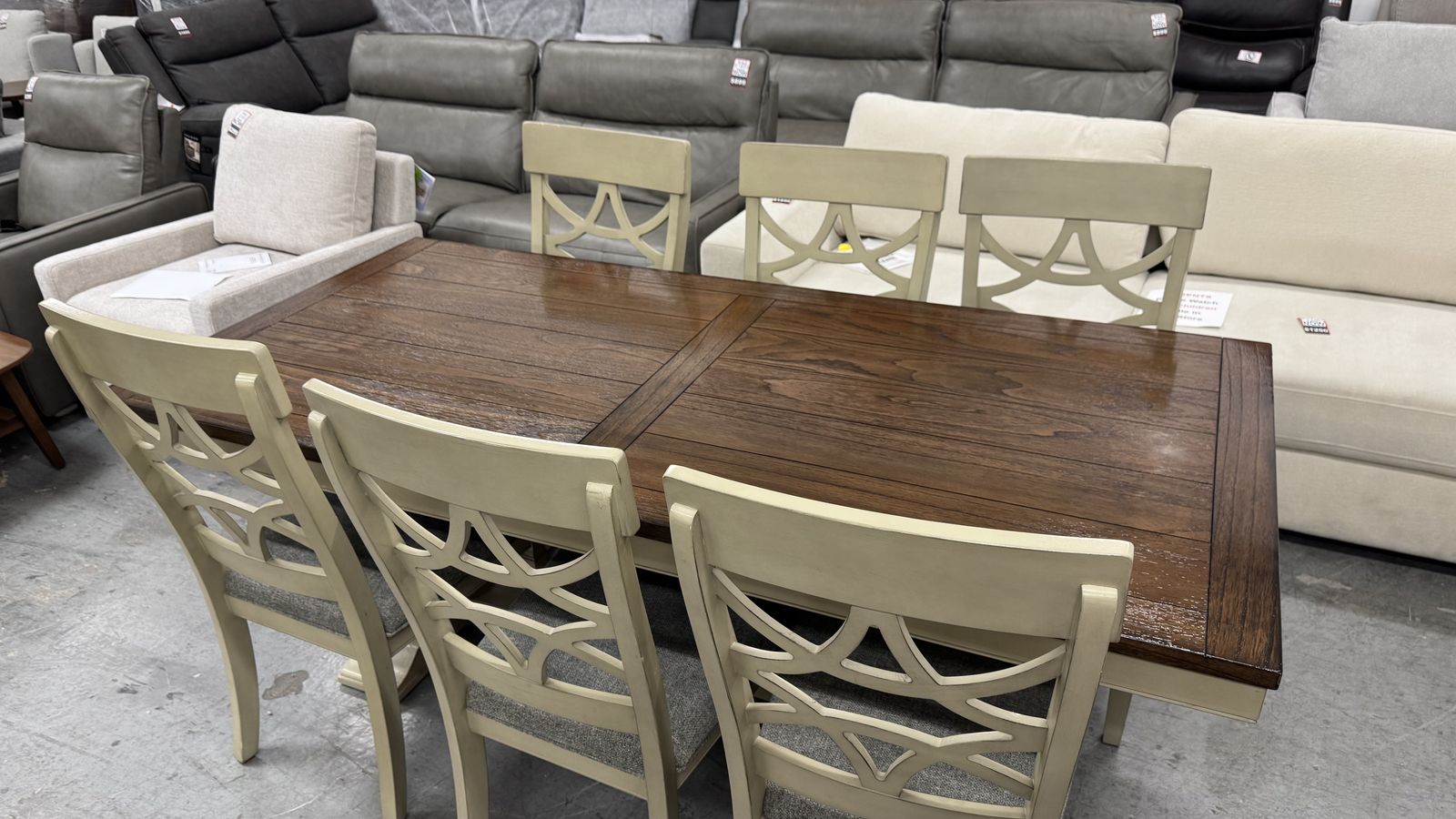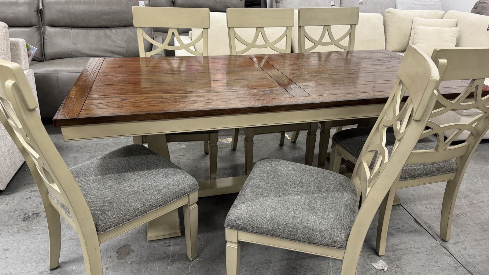 Mahogany solids and mindi veneers Stain resistant fabric Adjustable levellers Hand distressed finish Assembly required Includes: 1 table and 6 chairs Specifications: