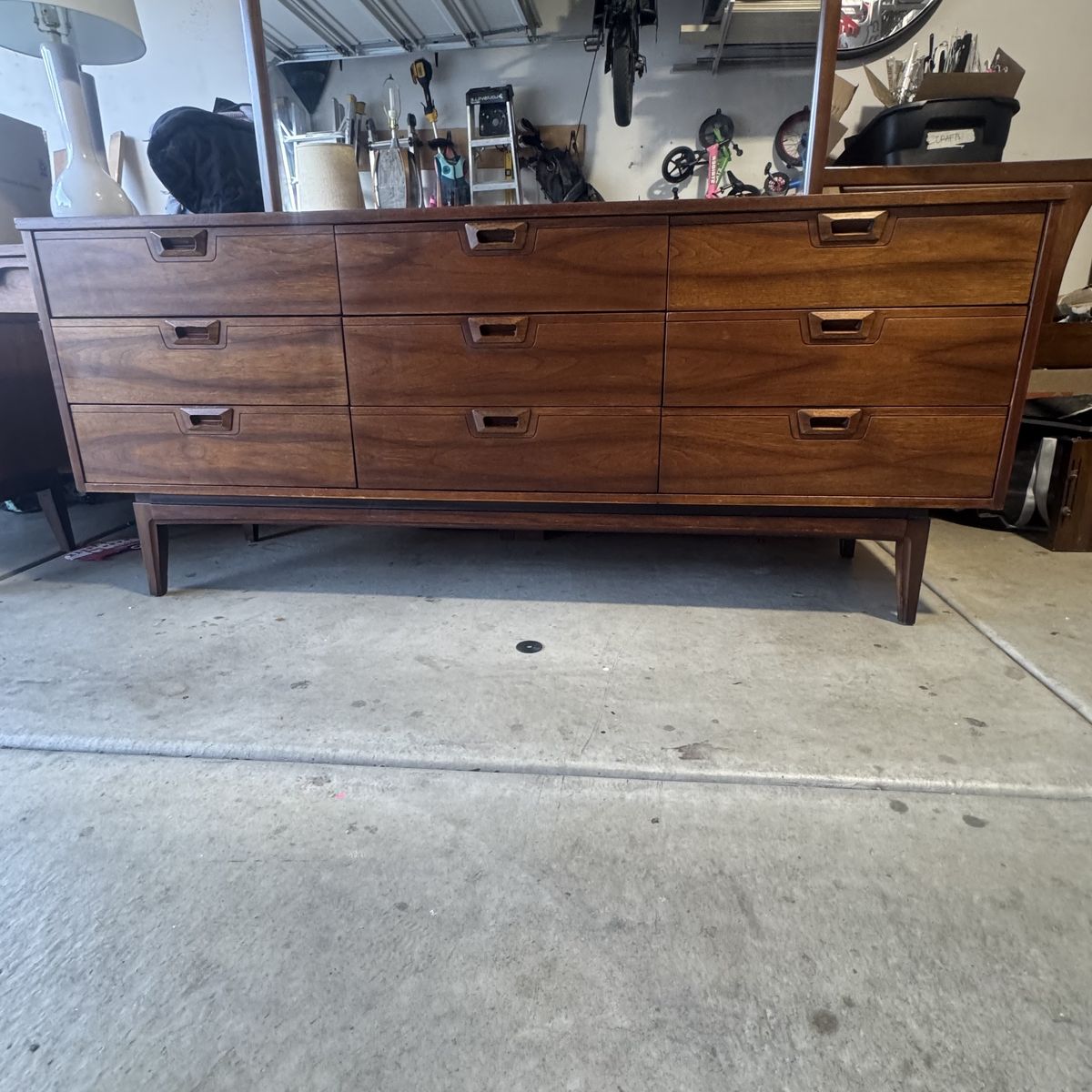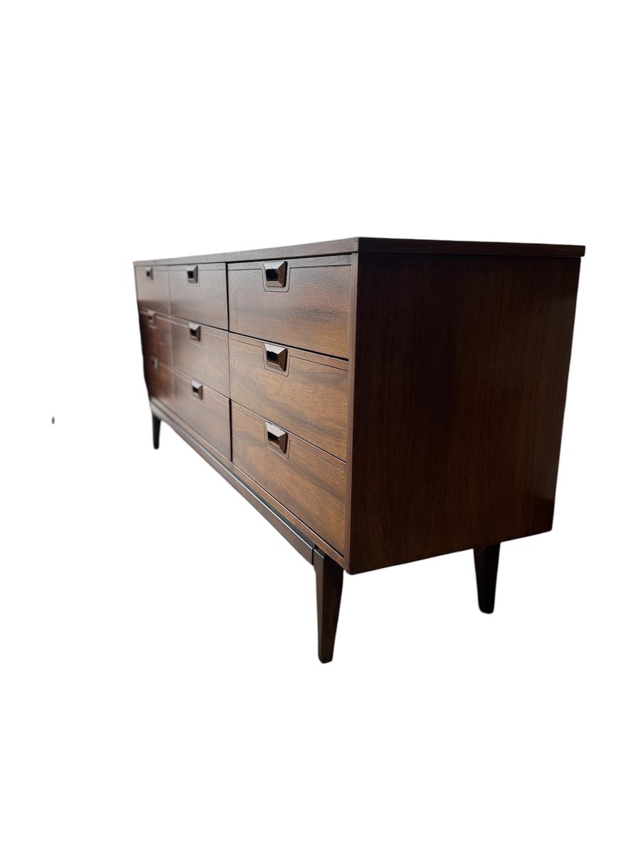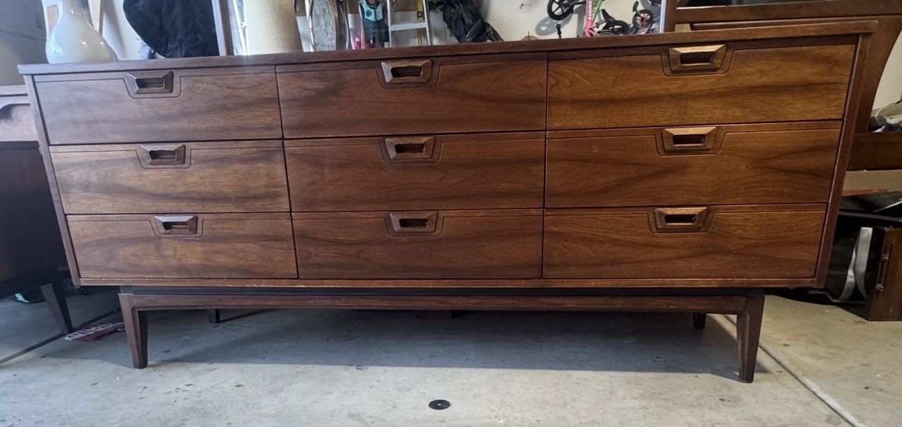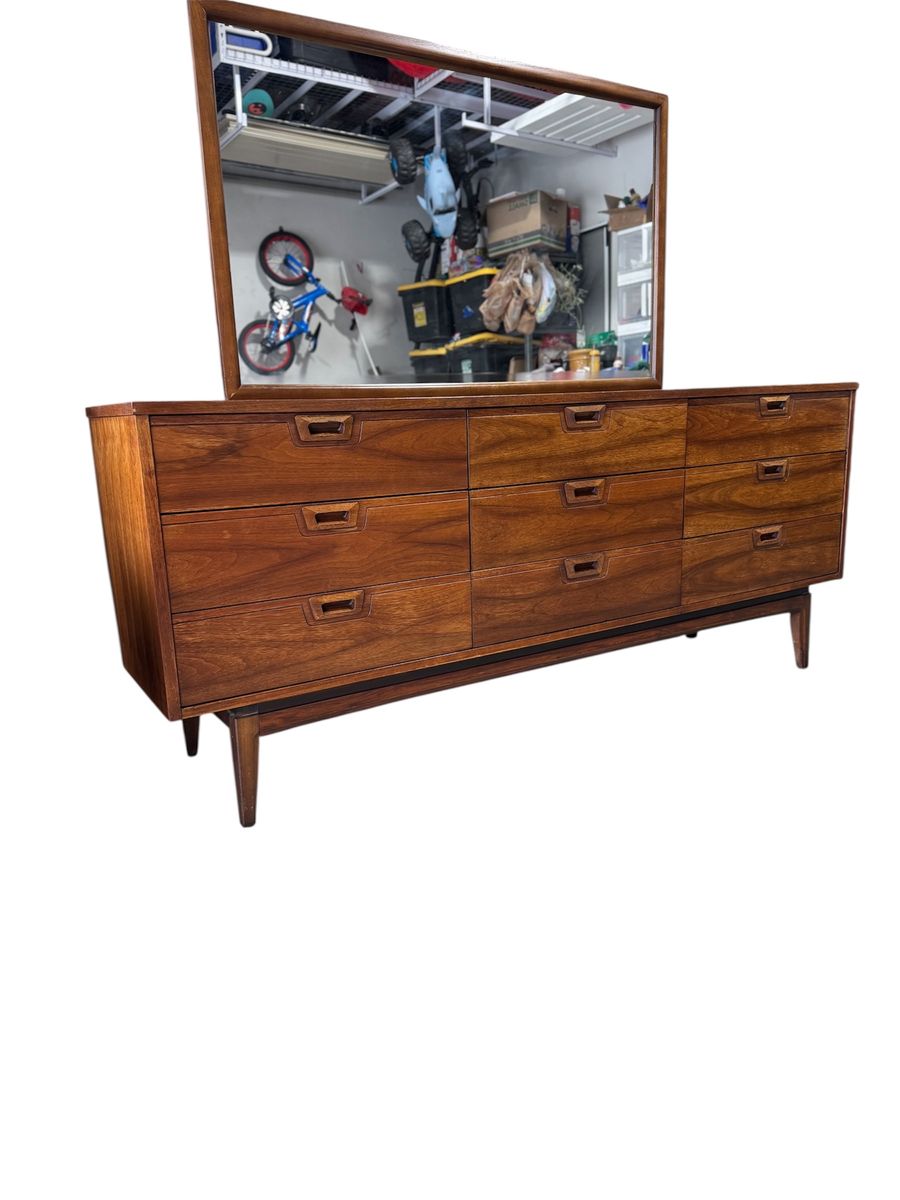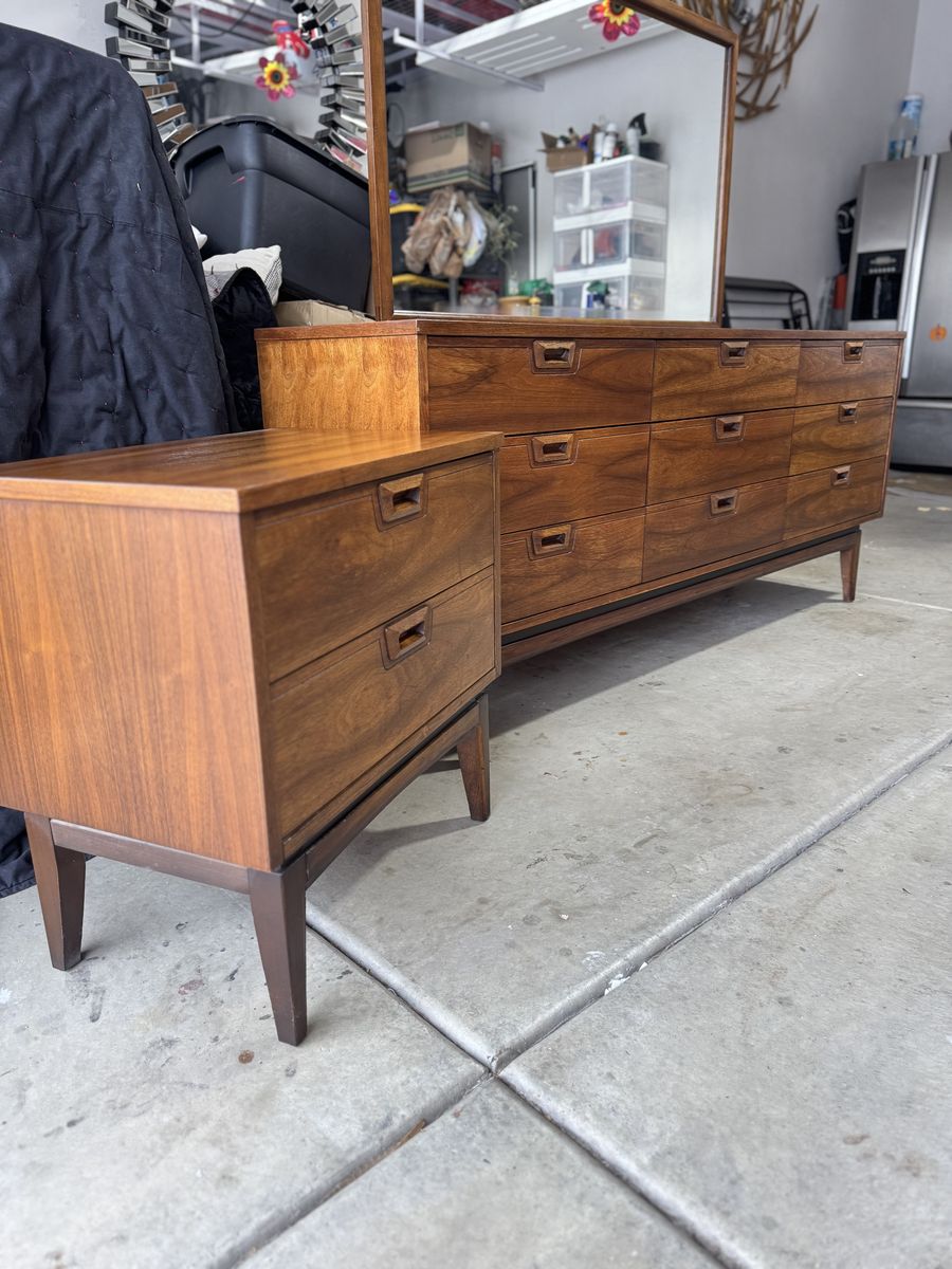 Mid Century Modern Walnut Bedroom Set – JB Van Sciver Style – Dresser, Mirror, Nightstand & Full/Queen Headboard