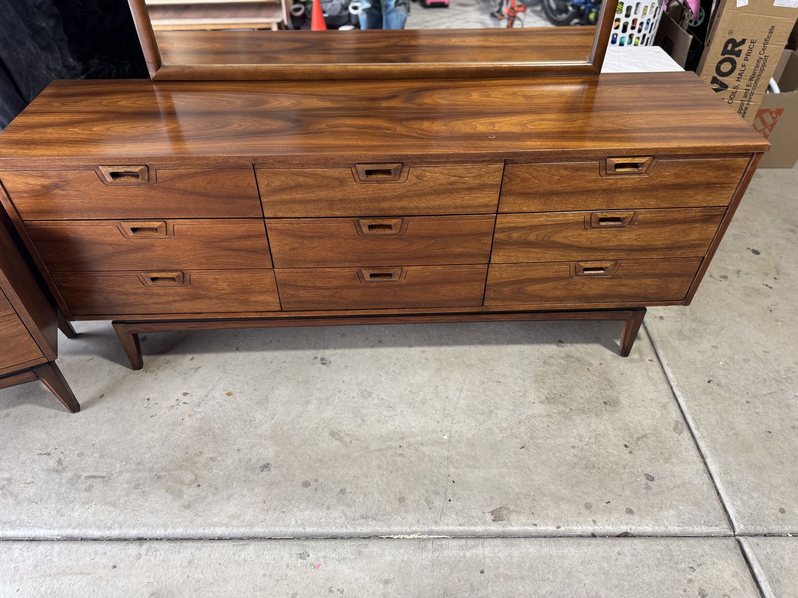 The dresser offers plenty of storage with nine smooth-sliding drawers and the signature mid-century recessed pulls. The mirror attaches to the back of the dresser and completes the look beautifully.