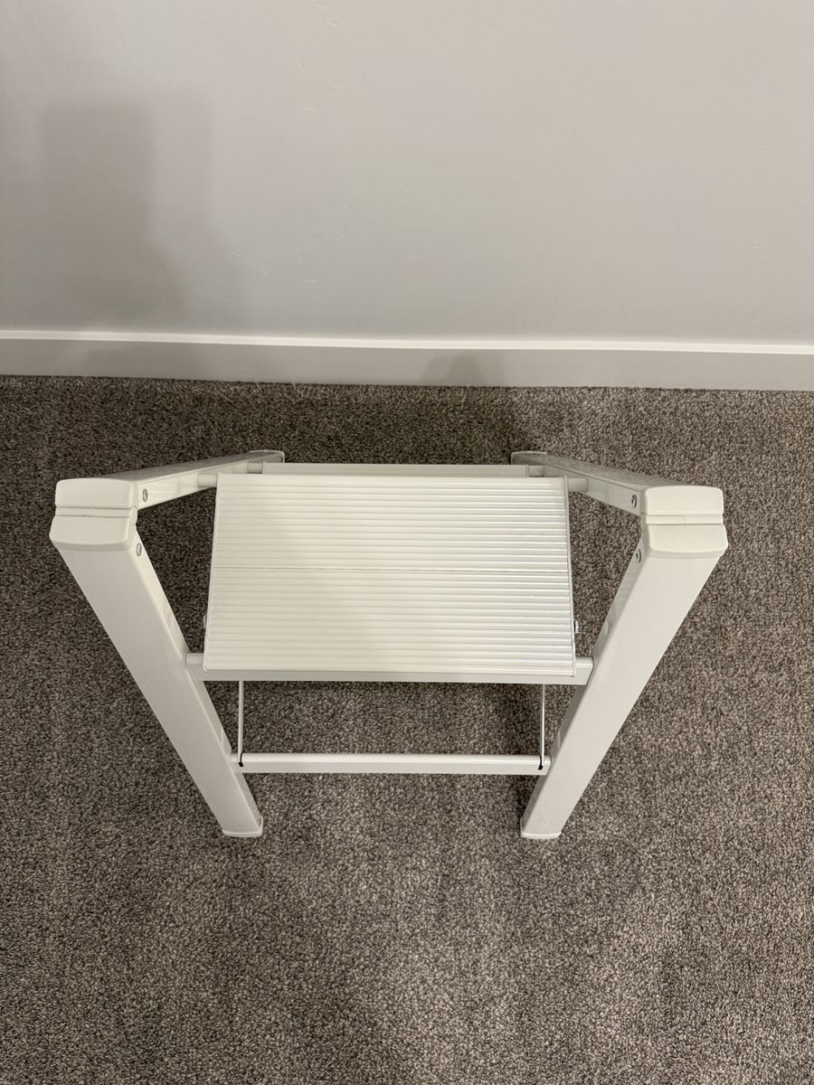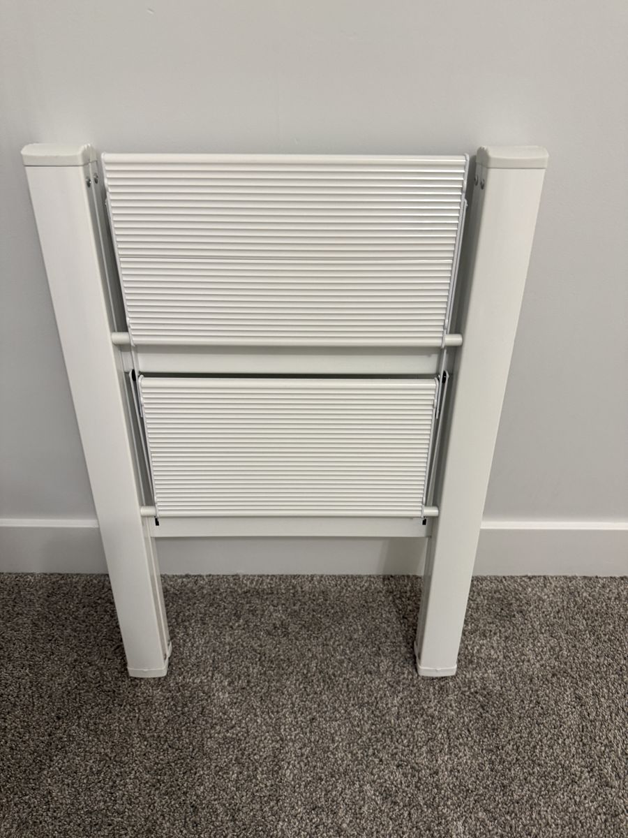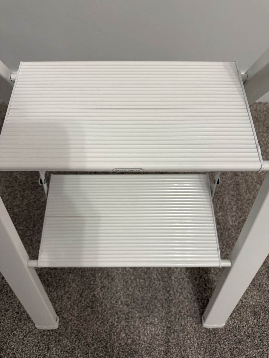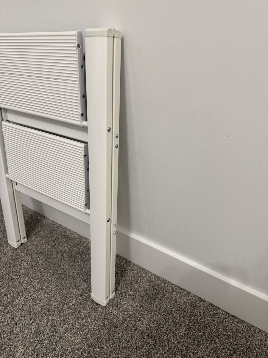 VenmoFoldable step ladder. 300 lb capacity. Anti slip pedals. Open size: 21.3 x 17.5 x 23.6 inches. Folded size: 26.2 x 17.5 x 1.9 inches. Weighs 6.6 lbs. Made of alloy steel.