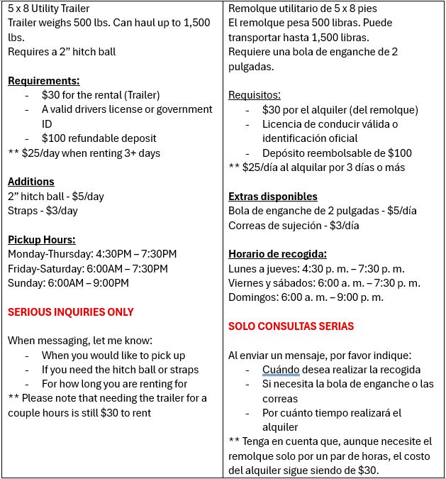 Zelle5 x 8 Utility Trailer Trailer weighs 500 lbs. Can haul up to 1,500 lbs. Requires a 2” hitch ball Requirements: $30 for the rental (Trailer) A valid drivers license or government ID $100 refundable deposit ** $25/day when renting 3+ days Additions 2” hitch ball - $5/day Straps - $3/day Pickup Hours: Monday-Thursday: 4:30PM – 7:30PM Friday-Saturday: 6:00AM – 7:30PM Sunday: 6:00AM – 9:00PM SERIOUS INQUIRIES ONLY When messaging, let me know: When you would like to pick up If you need the hitch ball or straps For how long you are renting for ** Please note that needing the trailer for a couple hours is still $30 to rent ————————————————- Remolque utilitario de 5 x 8 pies El remolque pesa 500 libras. Puede transportar hasta 1,500 libras. Requiere una bola de enganche de 2 pulgadas. Requisitos: $30 por el alquiler (del remolque) Licencia de conducir válida o identificación oficial Depósito reembolsable de $100 ** $25/día al alquilar por 3 días o más Extras disponibles Bola de enganche de 2 pulgadas - $5/día Correas de sujeción - $3/día Horario de recogida: Lunes a jueves: 4:30 p. m. – 7:30 p. m. Viernes y sábados: 6:00 a. m. – 7:30 p. m. Domingos: 6:00 a. m. – 9:00 p. m. SOLO CONSULTAS SERIAS Al enviar un mensaje, por favor indique: Cuándo desea realizar la recogida Si necesita la bola de enganche o las correas Por cuánto tiempo realizará el alquiler ** Tenga en cuenta que, aunque necesite el remolque solo por un par de horas, el costo del alquiler sigue siendo de $30.