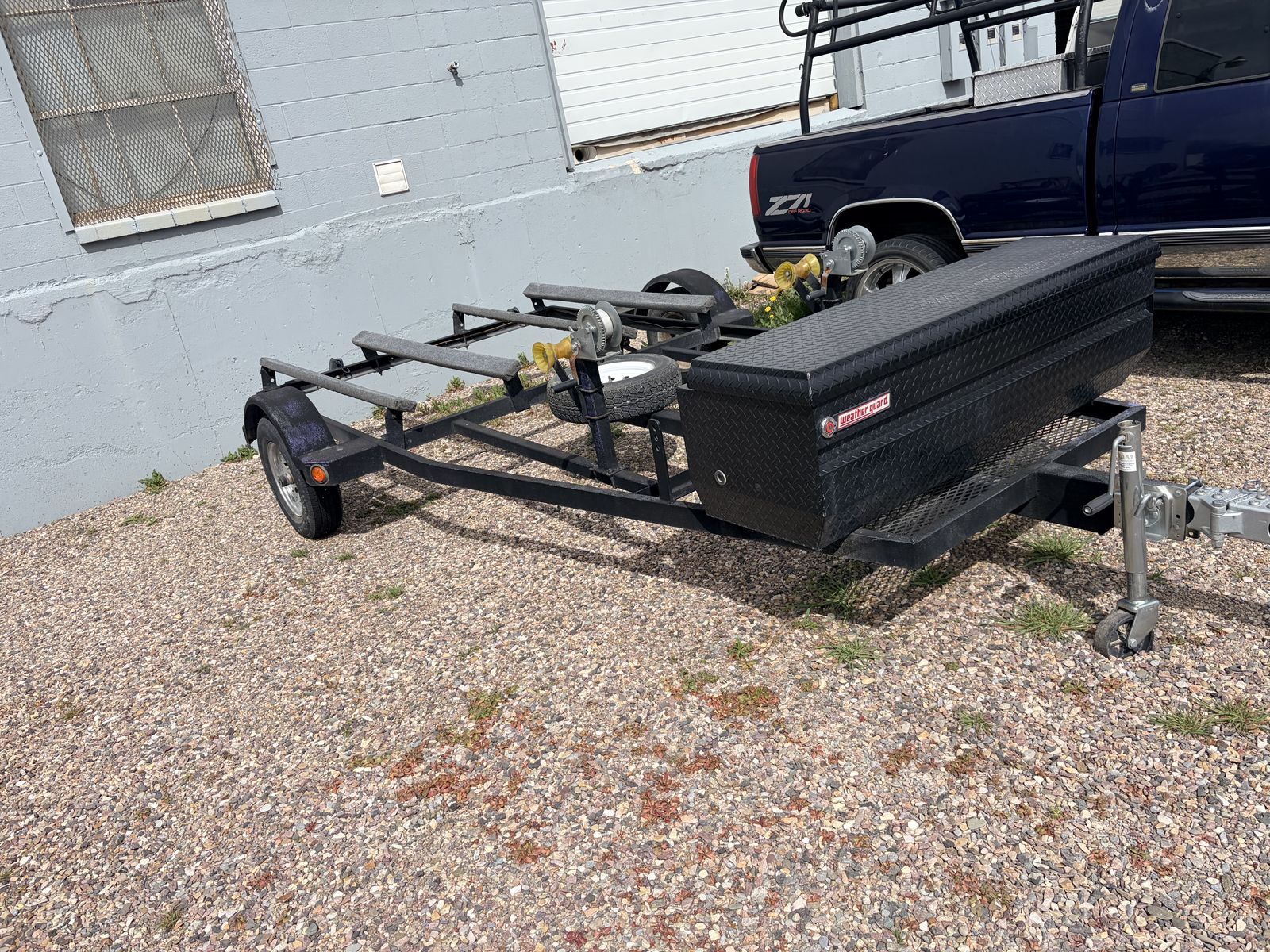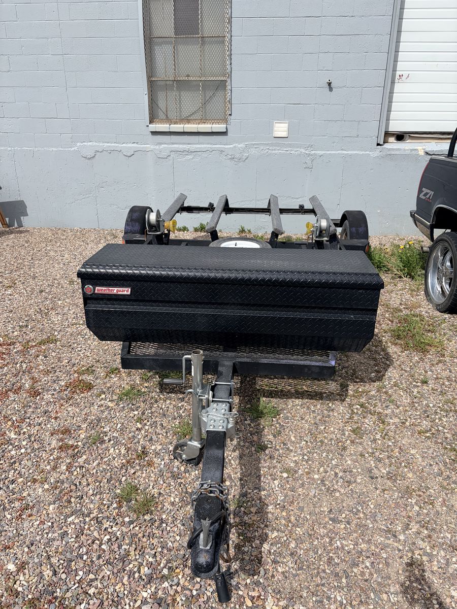 Trailer is in good shape. Replaced hubs and bearing with brand new hubs, bearings, and added bearing buddy kit. Trailer has a folding tongue. Mounted spare tire in the middle of the trailer. Also has a large Weather Guard front locker with two keys.