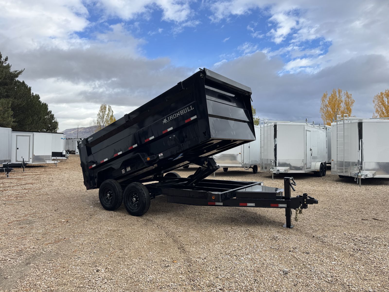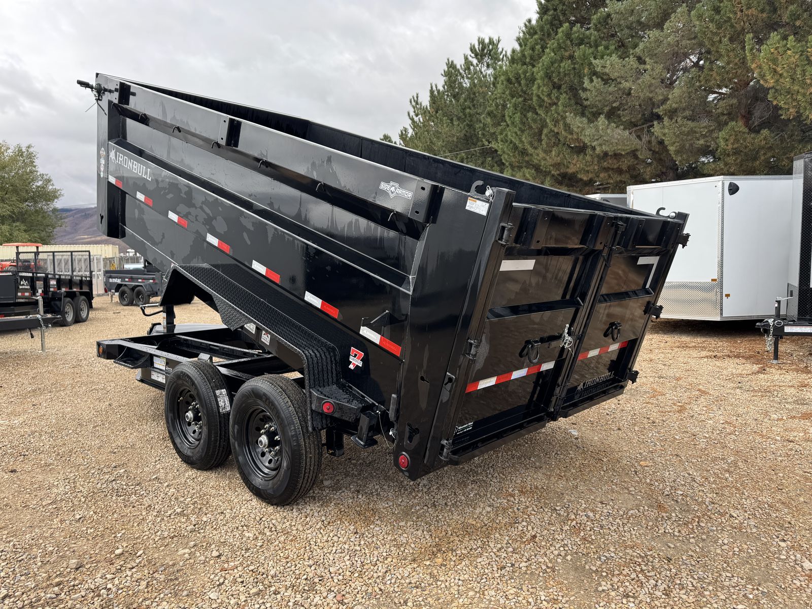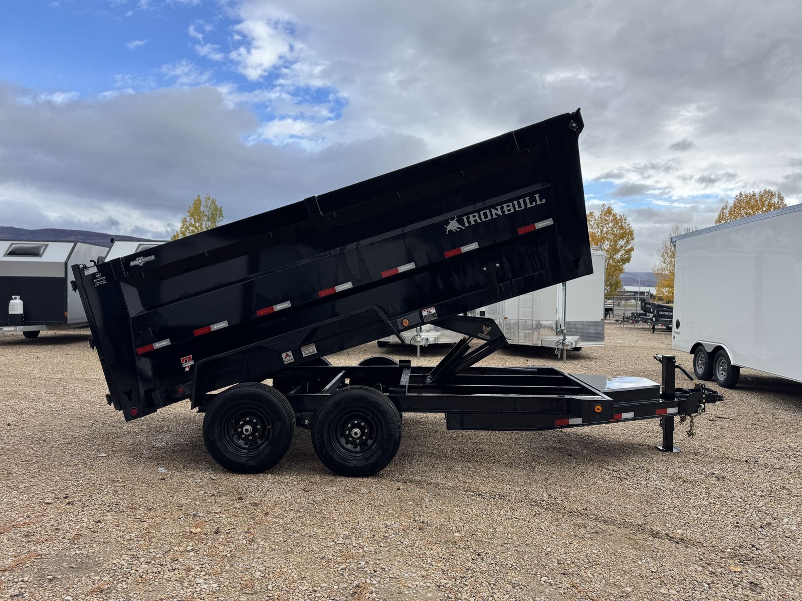 Introducing Iron Bull's NEW DTB MODEL! With 14,900 lbs capacity, these 83" wide dumps are built tough. Features include a 7-gauge floor, sturdy 10-gauge sides, and unique under-bed structure. Plus, full-length bed runners, 10k jacks, and a three-way gate for flexibility. Equipped with brake axles, radial tires, and a durable powder coat finish. A scissor hoist, TecNiq LEDs, and a deep cycle battery ensure reliable performance. Standard accessories: tarp kit, spare tire mount, and more. Backed by our IronClad warranty. Conquer your hauling tasks with Iron Bull!